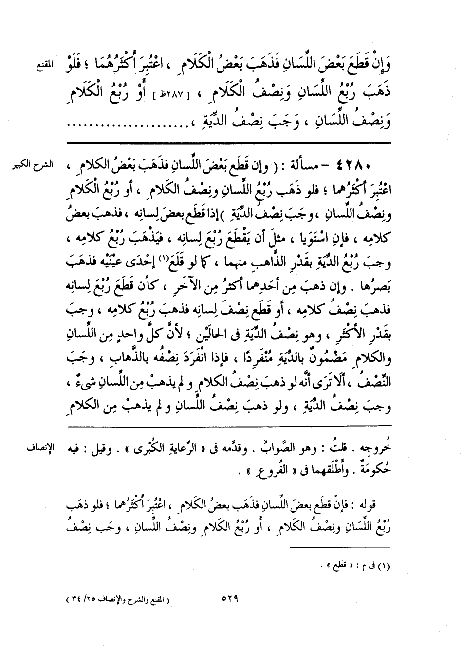 وَإِنْ قَطَعَ بَعْضَ اللِّسَانِ فَذَهَبَ بَعْضُ الْكَلَامِ، اعْتُبرَ أكْثَرُهُمَا؛ فَلَوْ ذَهَبَ رُبْعُ اللِّسَانِ وَنِصْفُ الْكَلَامِ، أَوْ رُبْعُ الْكَلَامِ وَنِصْفُ اللِّسَانِ، وَجَبَ نِصْفُ الدِّيَةِ،
