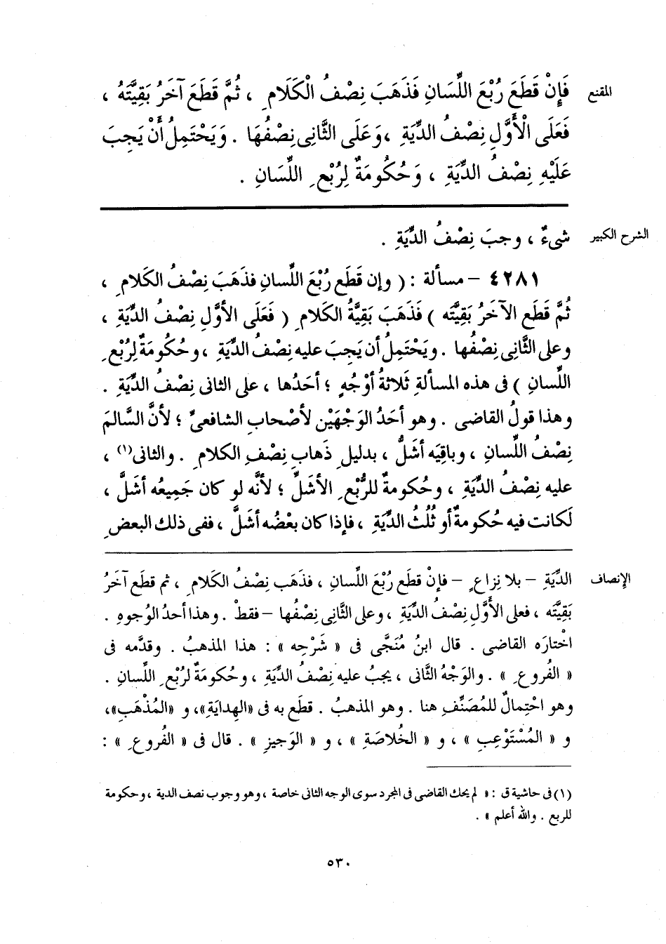 الدِّيَةِ -بلا نِزاعٍ- فإنْ قطع رُبْعَ اللِّسانِ، فذَهَب نِصْفُ الكَلامِ، ثم قطَع آخَرُ بَقِيَّتَه، فعلى الأَوَّلِ نِصْفُ الدِّيَةِ، وعلى الثَّانِى نِصْفُها -فقطْ. وهذا أحدُ الوُجوهِ. اخْتارَه القاضى. قال ابنُ مُنَجَّى فى «شَرْحِه»: هذا المذهبُ. وقدَّمه فى «الفُروعِ». والوَجْهُ الثَّانى، يجبُ عليه نِصْفُ الدِّيَةِ، وحُكومَةٌ لرُبْعِ اللسانِ. وهو احْتِمالٌ للمُصَنِّفِ هنا. وهو المذهبُ. قطَع به فى «الهِدايَةِ»، و «المُذْهَبِ»، و «المُسْتَوْعِبِ»، و «الخُلاصَةِ»، و «الوَجيزِ». قال فى «الفُروعِ»: