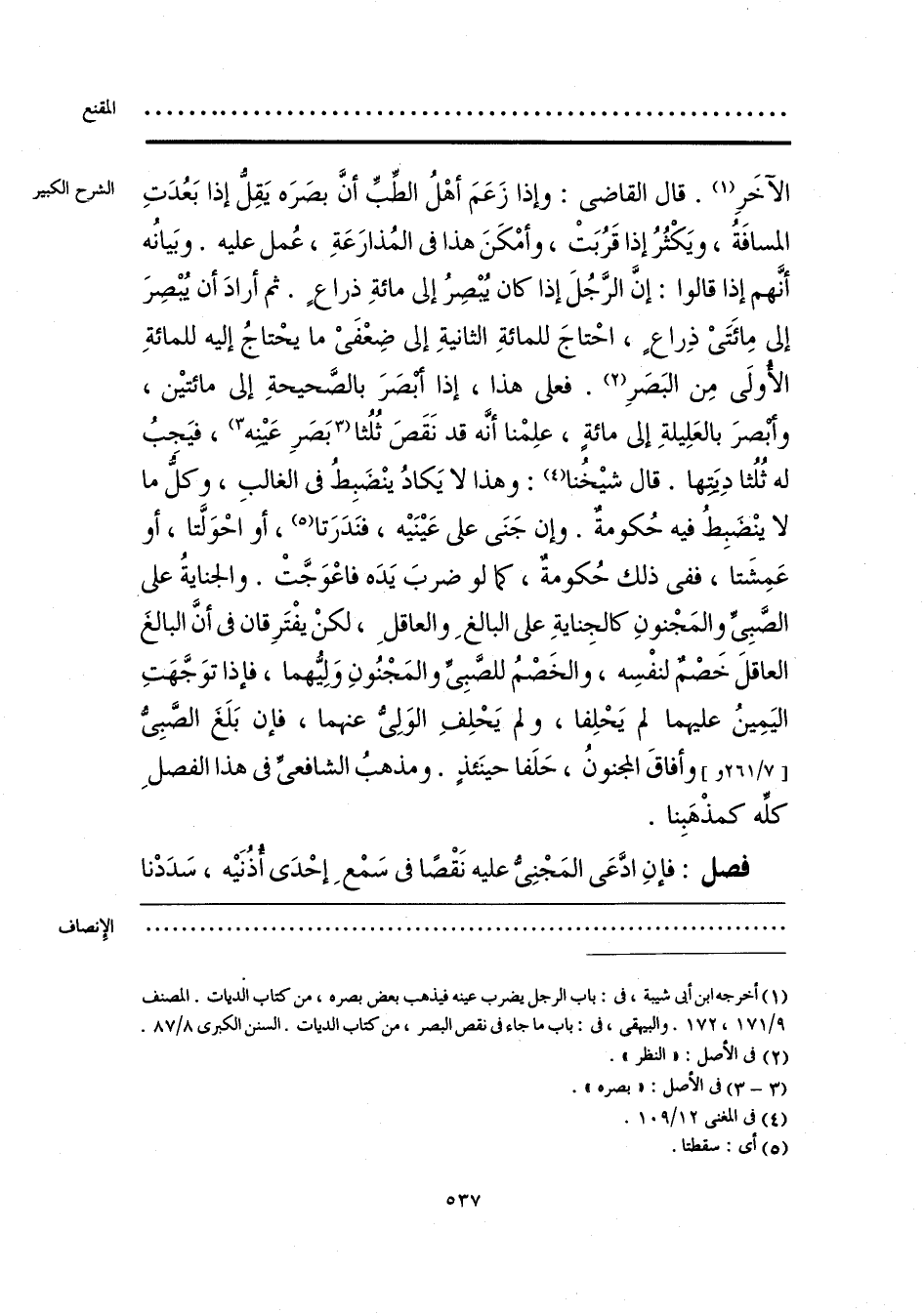 الآخَرِ (¬1). قال القاضى: وإذا زَعَمَ أهْلُ الطِّبِّ أنَّ بصَرَه يَقِلُّ إذا بَعُدَتِ المسافَةُ، ويَكْثُرُ إذا قَرُبَتْ، وأمْكَنَ هذا في المُذارَعَةِ، عُمل عليه. وبَيانُه أنَّهم إذا قالوا: إنَّ الرَّجُلَ إذا كان يُبْصِرُ إلى مائةِ ذراع. ثم أرادَ أن يُبْصِرَ إلى مِائَتَىْ ذِراعٍ، احْتاجَ للمائةِ الثَّانيةِ إلى ضِعْفَىْ ما يحْتاجُ إليه للمائةِ الأُولَى مِن البَصَرِ (¬2). فعلى هذا، إذا أْبصَرَ بالصَّحيحةِ إلى مائتيْن، وأبْصرَ بالعَلِيلةِ إلى مائةٍ، علِمْنا أنَّه قد نَقَصَ ثُلُثا [بَصَرِ عَيْنِه] (¬3)، فيَجبُ له ثُلُثا دِيَتِها. قال شيْخُنا (¬4): وهذا لا يَكادُ ينْضَبِطُ في الغالبِ، وكلُّ ما لا ينْضَبِطُ فيه حُكومةٌ. وإن جَنَى على عَيْنَيْه، فنَدَرَتا (¬5)، أو احْوَلَّتا، أو عَمِشَتا، ففى ذلك حُكومةٌ، كما لو ضربَ يَدَه فاعْوَجَّتْ. والجنايةُ على الصَّبِىِّ والمَجْنونِ كالجِنايةِ على البالغِ والعاقلِ، لكنْ يفْتَرِقان في أنَّ البالغَ العاقلَ خصْمٌ لنفْسِه، والخَصْمُ للصَّبِىِّ والمَجْنُونِ وَلِيُّهما، فإذا توَجَّهَتِ اليَمِينُ عليهما لم يَحْلِفا, ولم يَحْلِفِ الوَلِىُّ عنهما، فإن بَلَغَ الصَّبِىُّ وأفاقَ المجنونُ، حَلَفا حينَئذٍ. ومذهبُ الشافعىِّ في هذا الفصلِ كلِّه كمذْهَبِنا.