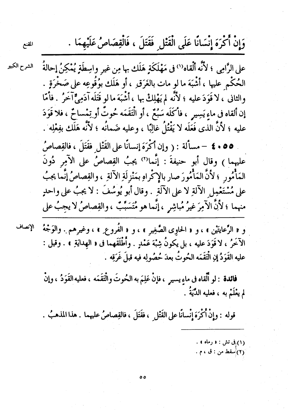 و «الرِّعايتَيْن»، و «الحاوِى الصَّغِيرِ»، و «الفُروعِ»، وغيرِهم. والوَجْهُ الآخَرُ، لا قَوَدَ عليه، بل يكونُ شِبْهَ عَمْدٍ. وأطْلَقَهما فى «الهِدايَةِ». وقيل: عليه القَوَدُ إنِ الْتَقَمَه الحُوتُ بعدَ حُصُولِه فيه قبلَ غَرَقِه.
