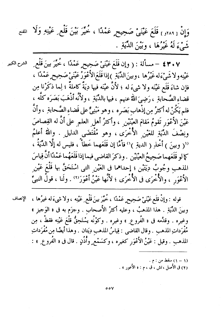 قوله: وإنْ قلَع عَيْنَىْ صَحِيحٍ عَمْدًا، خُيِّرَ بينَ قَلْعِ عَيْنِه، ولا شئَ له غيرُها، وبينَ الدِّيَةِ. هذا المذهبُ، وعليه أكثرُ الأصحابِ. وجزَم به فى «الوَجيزِ» وغيرِه. وقدَّمه فى «الفُروعِ» وغيرِه. وكوْنُه يسْتَحِقُّ قلْعَ عَيْنِه فقطْ، مِن مُفْرَداتِ المذهبِ. وقال القاضى: قِياسُ المذهبِ دِيَتان. وهذا أيضًا مِن مُفْرَداتِ المذهبِ. وقيل: عَيْنُ الأعْوَرِ كغيرِه، وكسَمْع وأُذُنٍ. قال فى «الفُروعِ»: