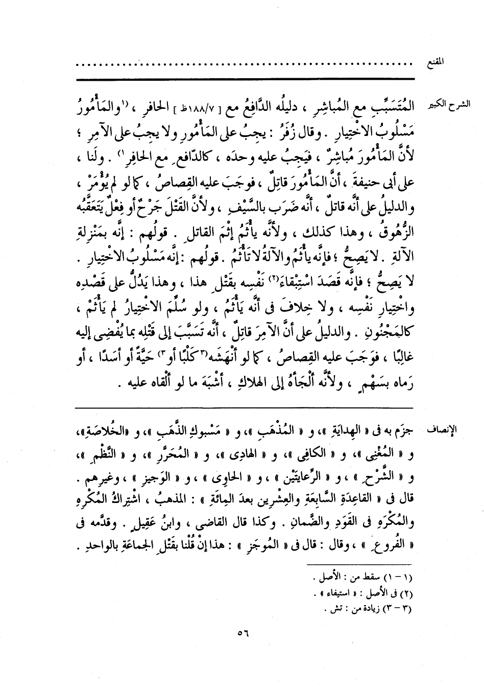 جزَم به فى «الهِدايَةِ»، و «المُذْهَبِ»، و «مَسْبوكِ الذَّهَبِ»، و «الخُلاصَةِ»، و «المُغْنِى»، و «الكافِى»، و «الهادِى»، و «المُحَرَّرِ»، و «النَّظْمِ»، و «الشَّرْحِ»، و «الرِّعايتَيْن»، و «الحاوِى»، و «الوَجيزِ»، وغيرِهم. قال فى «القاعِدَةِ السَّابِعَةِ والعِشْرِين بعدَ المِائَةِ»: المذهبُ، اشْتِراكُ المُكرِهِ والمُكْرَهِ فى القَوَدِ والضَّمانِ. وكذا قال القاضى، وابنُ عَقِيلٍ. وقدَّمه فى «الفُروعِ»، وقال: قال فى «المُوجَزِ»: هذا إنْ قُلْنا بقَتْلِ الجماعَةِ بالواحدِ.