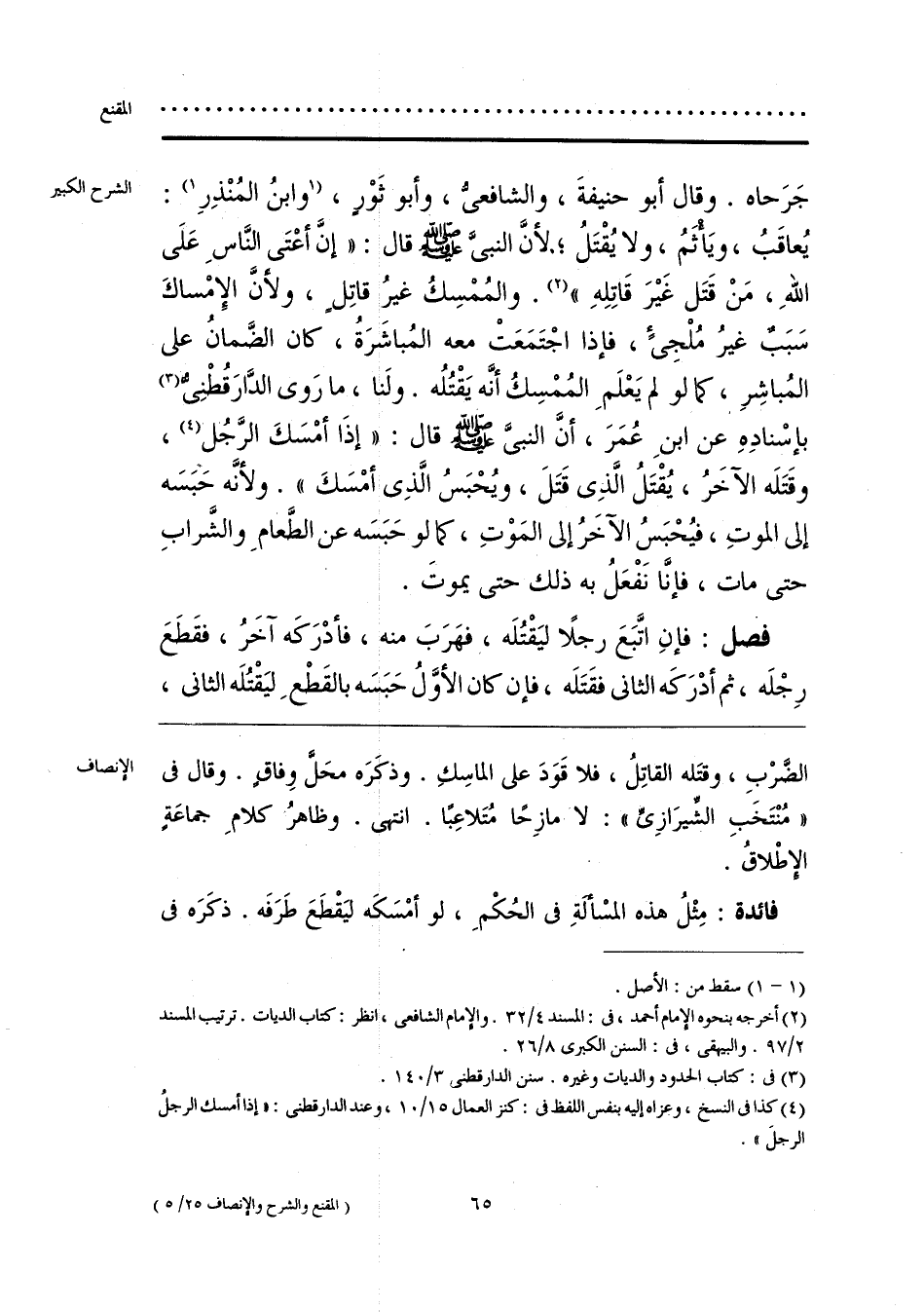 الضَّرْبِ، وقتَله القاتِلُ، فلا قَوَدَ على الماسِكِ. وذكَرَه محَلَّ وِفاقٍ. وقال فى «مُنْتَخَبِ الشِّيرَازِىِّ»: لا مازِحًا مُتَلاعِبًا. انتهى. وظاهرُ كلامِ جماعَةٍ الإِطْلاقُ.