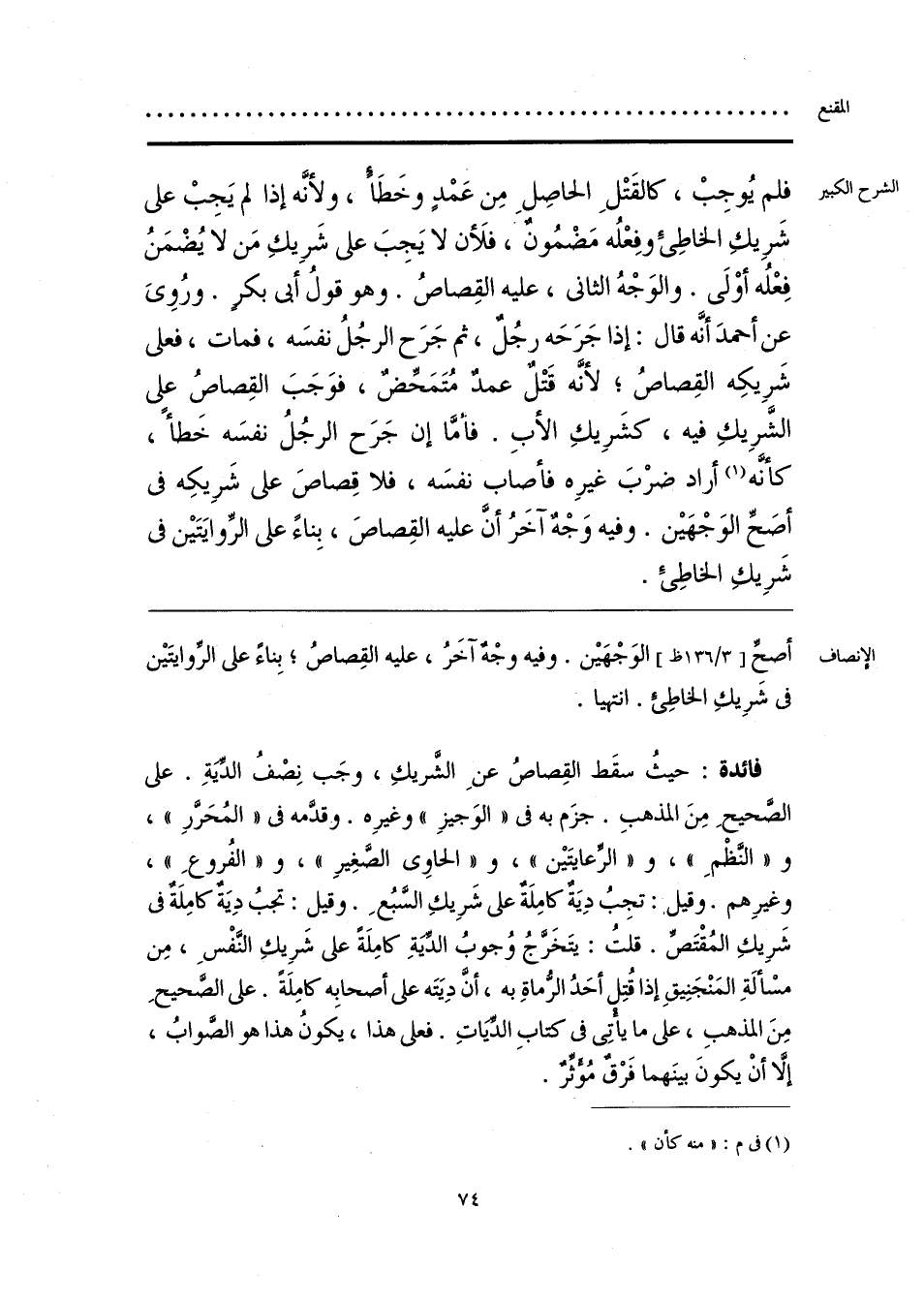 فائدة: حيثُ سقَط القِصاصُ عنِ الشَّريكِ، وجَب نِصْفُ الدِّيَةِ. على الصَّحيحِ مِنَ المذهبِ. جزَم به فى «الوَجيزِ» وغيرِه. وقدَّمه فى «المُحَرَّرِ»، و «النَّظْمِ»، و «الرِّعايتَيْن»، و «الحاوِى الصَّغِيرِ»، و «الفُروعِ»، وغيرِهم. وقيل: تجِبُ دِيَةٌ كامِلَةٌ على شَرِيكِ السَّبُعِ. وقيل: تجبُ دِيَةٌ كامِلَةٌ فى شَرِيكِ المُقْتَصِّ. قلتُ: يتَخَرَّجُ وُجوبُ الدِّيَةِ كامِلَة على شَرِيكِ النَّفْسِ، مِن مسْألَةِ المَنْجَنِيقِ إذا قُتِل أحَدُ الرُّماةِ به، أنَّ دِيَتَه على أصحابِه كامِلَةً. على الصَّحيحِ مِنَ المذهبِ، على ما يأْتِى فى كتابِ الدِّيَاتِ. فعلى هذا، يكونُ هذا هو الصَّوابُ، إلَّا أَنْ يكونَ بينَهما فَرْقٌ مُؤثِّرٌ.