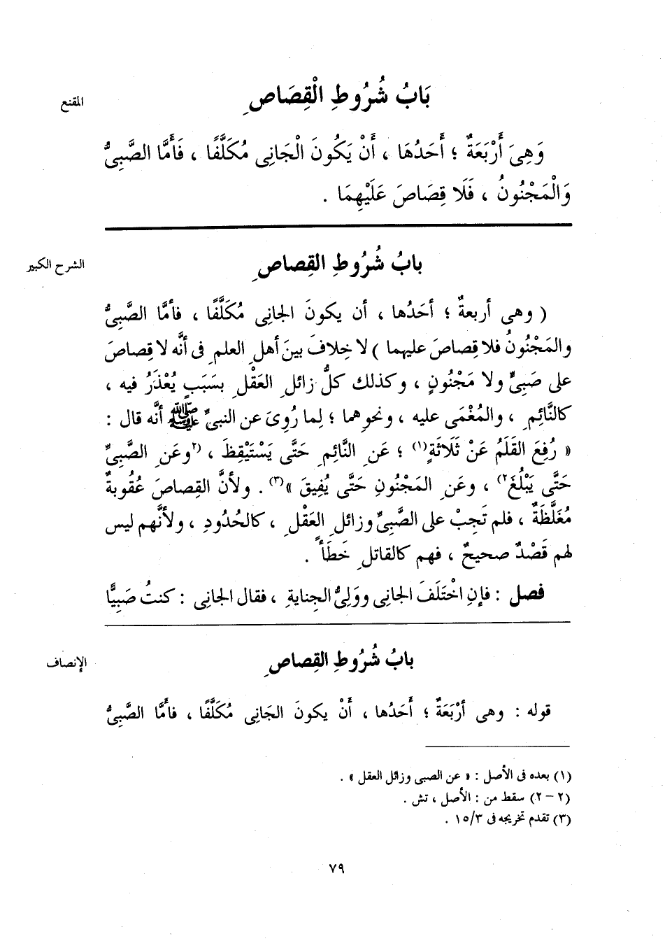 وَهِىَ أرْبَعَةٌ؛ أحَدُهَا، أَنْ يَكُونَ الْجَانِى مُكَلَّفًا، فَأَمَّا الصَّبِىُّ وَالْمَجْنُونُ، فَلَا قِصَاصَ عَلَيْهِمَا.