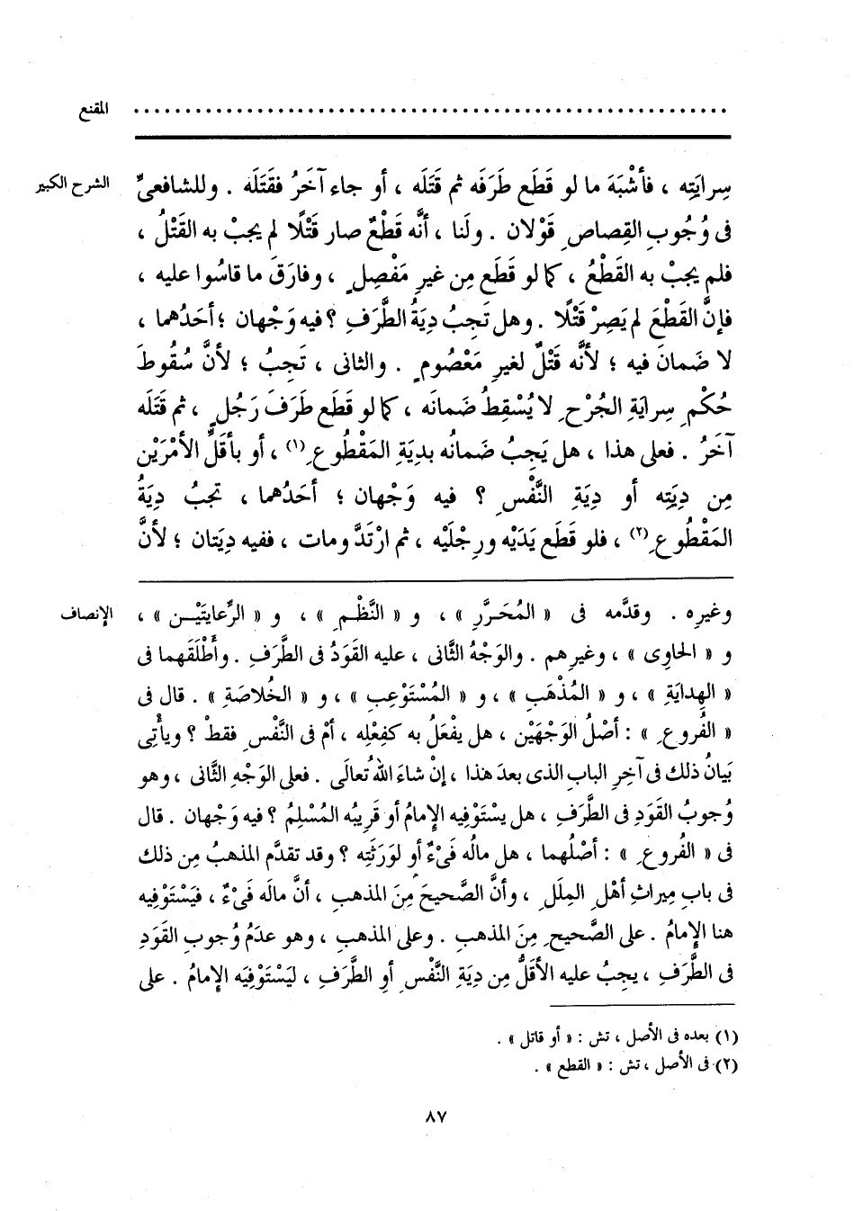 وغيرِه. وقدَّمه فى «المُحَرَّرِ»، و «النَّظْمِ»، و «الرِّعايتَيْن»، و «الحاوِى»، وغيرِهم. والوَجْهُ الثَّانى، عليه القَوَدُ فى الطَّرَفِ. وأَطْلَقَهما فى «الهِدايَةِ»، و «المُذْهَبِ»، و «المُسْتَوْعِبِ»، و «الخُلاصَةِ». قال فى «الفُروعِ»: أصْلُ الوَجْهَيْن، هل يفْعَلُ به كفِعْلِه، أمْ فى النَّفْسِ فقطْ؟ ويأْتِى بَيانُ ذلك فى آخِرِ البابِ الذى بعدَ هذا، إنْ شاءَ اللَّهُ تعالَى. فعلى الوَجْهِ الثَّانى، وهو وُجوبُ القَوَدِ فى الطَّرَفِ، هل يسْتَوْفِيه الإِمامُ أو قَرِيبُه المُسْلِمُ؟ فيه وَجْهان. قال فى «الفُروعِ»: أصْلُهما، هل مالُه فَىْءٌ أو لوَرَثَتِه؟ وقد تقدَّم المذهبُ مِن ذلك فى بابِ مِيراثِ أَهْلِ المِلَلِ، وأنَّ الصَّحيحَ مِنَ المذهبِ، أنَّ مالَه فَىْءٌ، فيَسْتَوْفِيه هنا الإِمامُ. على الصَّحيحِ مِنَ المذهبِ. وعلى المذهبِ، وهو عدَمُ وُجوبِ القَوَدِ فى الطَّرَفِ، يجِبُ عليه الأقَلُّ مِن دِيَةِ النَّفْسِ أوِ الطَّرَفِ، ليَسْتَوْفِيَه الإِمامُ. على