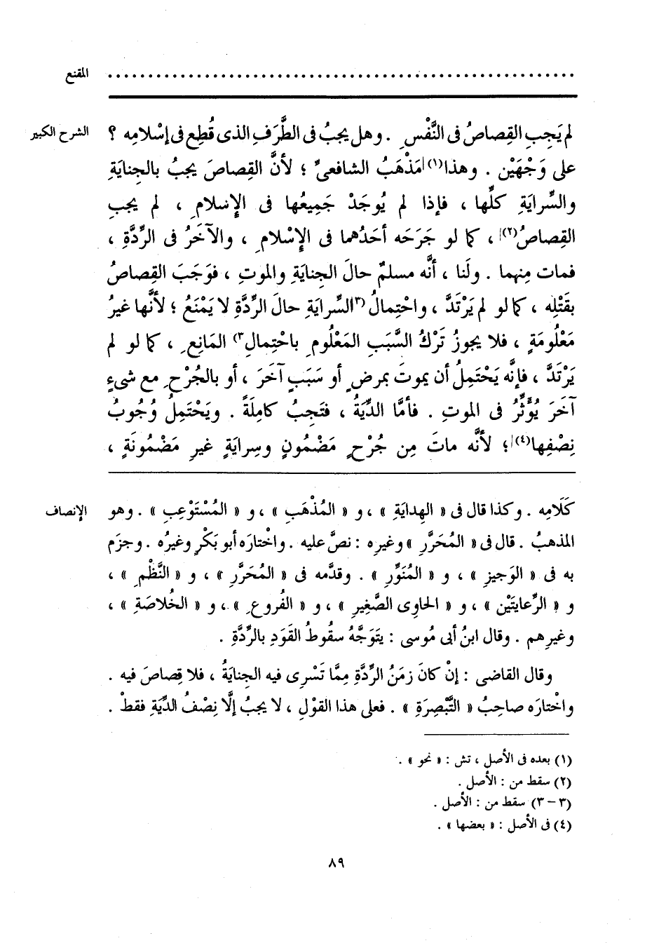 كَلَامِه. وكذا قال فى «الهِدايَةِ»، و «المُذْهَبِ»، و «المُسْتَوْعِبِ». وهو المذهبُ. قال فى «المُحَرَّرِ» وغيرِه: نصَّ عليه. واخْتارَه أبو بَكْرٍ وغيرُه. وجزَم به فى «الوَجيزِ»، و «المُنَوِّرِ». وقدَّمه فى «المُحَرَّرِ»، و «النَّظْمِ»، و «الرِّعايتَيْن»، و «الحاوِى الصَّغِيرِ»، و «الفُروعِ»، و «الخُلاصَةِ»، وغيرِهم. وقال ابنُ أبى مُوسى: يتَوَجَّهُ سقُوطُ القَوَدِ بالرِّدَّةِ.