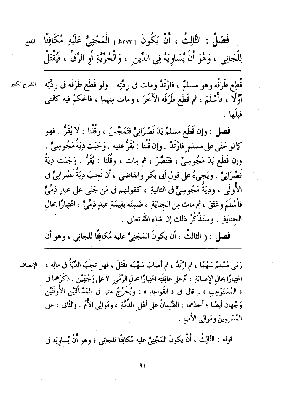 فَصْلٌ: الثَّالِثُ، أَنْ يَكُونَ الْمَجْنِىُّ عَلَيْهِ مُكَافِئًا لِلْجَانِى، وَهُوَ أَنْ يُسَاوِيَهُ فِى الدِّينِ، وَالْحُرِّيَّةِ أوِ الرِّقِّ، فَيُقْتَلُ