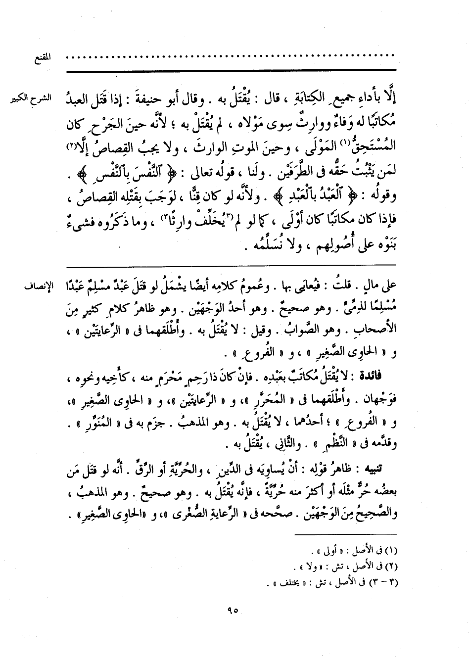 تنبيه: ظاهرُ قوْلِه: أَنْ يُساوِيَه فى الدِّينِ، والحُرِّيَّةِ أو الرِّقِّ. أنَّه لو قتَل مَن بعضُه حُرٌّ مثْلَه أو أكثرَ منه حُرِّيَّةً، فإنَّه يُقْتَلُ به. وهو صحيحٌ. وهو المذهبُ، والصَّحِيحُ مِنَ الوَجْهَيْن. صحَّحه فى «الرِّعايَةِ الصُّغْرى»، و «الحاوِى الصَّغِيرِ».