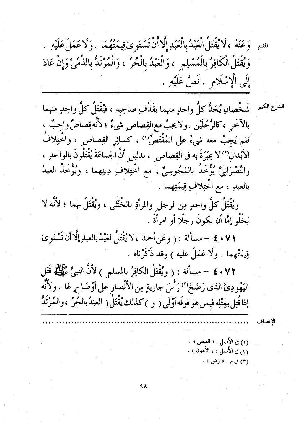 وَعَنْهُ، لَا يُقْتَلُ الْعَبْدُ بِالْعَبْدِ إِلَّا أَن تَسْتَوِىَ قِيمَتُهُمَا. وَلَا عَمَلَ عَلَيْهِ. وَيُقْتَلُ الْكَافِرُ بِالْمُسْلِمِ، وَالْعَبْدُ بِالْحُرِّ، وَالْمُرْتَدُّ بِالذِّمِّىِّ وَإِنْ عَادَ إِلَى الْإِسْلَامِ. نَصَّ عَلَيْهِ.