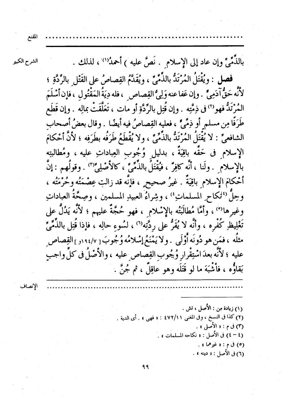 فصل: ويُقْتَلُ المُرْتَدُّ بالذِّمِّىِّ، ويُقَدَّمُ القِصاصُ على القَتْلِ بالرِّدَّةِ؛ لأنَّه حَقُّ آدَمِىٍّ. وإن عَفا عنه وَلِىُّ القِصاصِ، فله دِيَةُ المَقْتُولِ، فإن أسْلَمَ المُرْتَدُّ فهو (¬2) في ذِمَّتِه. وإن قُتِل بالرِّدَّةِ أو مات، تَعَلَّقَتْ بمالِه. وإن قَطَع طَرَفًا مِن مسلم أو ذِمِّىٍّ، فعليه القِصاصُ فيه أيضًا. وقال بعضُ أصحابِ الشافعىِّ: لا يُقْتَلُ المُرْتَدُّ بالذِّمِّىِّ، ولا يُقْطَعُ طَرَفُه بطَرَفِه؛ لأَنَّ أحْكامَ الإِسلامِ في حَقِّه باقِيَةٌ، بدليلِ وُجُوبِ العِباداتِ عليه، ومُطالبتِه بالإِسلامِ. ولَنا، أنَّه كافِرٌ، فيُقْتَلُ بالذِّمِّىِّ، كالأصْلِىِّ (¬3). وقولُهم: إنَّ أحْكامَ الإِسلامِ باقِيَةٌ. غيرُ صحيحٍ، فإنَّه قد زالت عِصْمَتُه وحُرْمَتُه، وحِلُّ [نكاحِ المسلماتِ] (¬4)، وشِراءُ العبيدِ المسلمين، وصِحَّةُ العباداتِ وغيرِها (¬5)، وأمَّا مُطالَبَتُه بالإِسْلام، فهو حُجَّةٌ عليهم؛ لأنَّه يَدُلُّ على تَغْلِيظِ كُفْرِه، وأنَّه لا يُقَرُّ على رِدَّتِه (¬6)، لسُوءِ حالِه، فإذا قُتِل بالذِّمِّىِّ مثلُه، فمَن هو دُونَه أَوْلَى. ولا يَمْنَعُ إسْلامُه وُجُوبَ القِصاصِ عليه؛ لأنَّه بعدَ اسْتِقْرارِ وُجُوبِ القِصاصِ عليه، والأَصْلُ في كلِّ واجبٍ بَقاؤُه، فأشْبَهَ ما لو قَتَلَه وهو عاقِلٌ، ثم جُنَّ.
