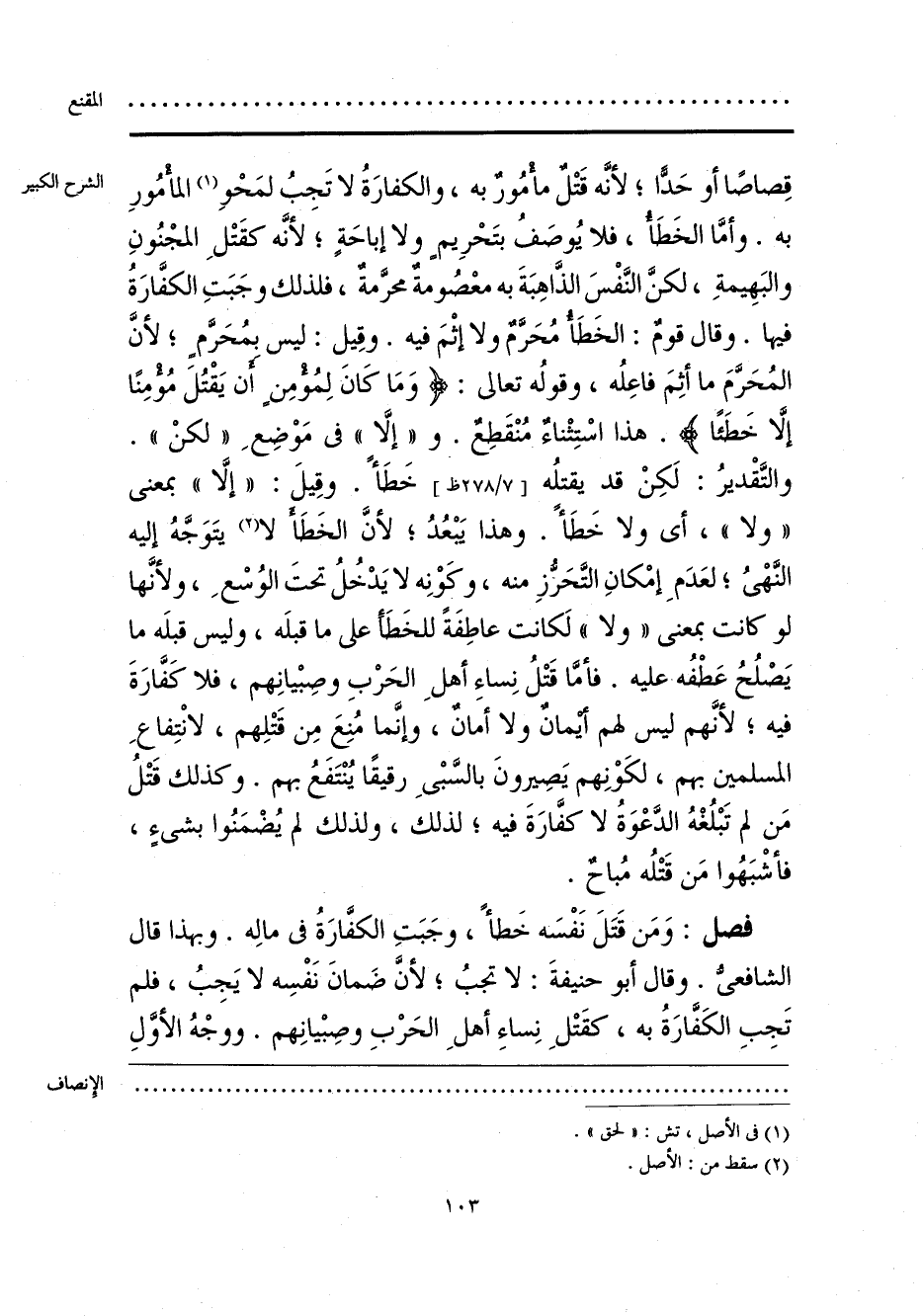 قِصاصًا أو حَدًّا؛ لأنَّه قَتْلٌ مأْمُورٌ به، والكفارَةُ لا تَجِبُ لمَحْوِ (¬1) المأْمُورِ به. وأمَّا الخَطَأُ، فلا يُوصَفُ بتَحْرِيمٍ ولا إباحَةٍ؛ لأنَّه كقَتْلِ المجْنُونِ والبَهِيمةِ، لكنَّ النَّفْسَ الذَّاهِبَةَ به معْصُومةٌ محرُّمةٌ، فلذلك وجَبَتِ الكفَّارَةُ فيها. وقال قومٌ: الخَطَأُ مُحَرَّمٌ ولا إثْمَ فيه. وقِيلِ: ليس بمُحَرُّمٍ؛ لأَنَّ المُحَرَّمَ ما أثِمَ فاعِلُه، وقولُه تعالى: {وَمَا كَانَ لِمُؤْمِنٍ أَنْ يَقْتُلَ مُؤْمِنًا إِلَّا خَطَأً}. هذا اسْتِثْناء مُنْقَطِع. و «إلَّا» في مَوْضِعِ «لكنْ». والتَّقْديرُ: لَكِنْ قد يقتلُه خَطَأً. وقِيلَ: «إلَّا» بمعنى «ولا»، أى ولا خَطَأً. وهذا يَبْعُدُ؛ لأَنَّ الخَطَأ لا (¬2) يتَوَجَّهُ إليه النَّهْىُ؛ لعَدَمِ إمْكانِ التَّحَرُّزِ منه، وكَوْنِه لا يَدْخُلُ تحتَ الوُسْعِ، ولأنَّها لو كانت بمعنى «ولا» لَكانت عاطِفَةً للخَطَأ على ما قبلَه، وليس قبلَه ما يَصْلُحُ عَطْفُه عليه. فأمَّا قَتْل نِساءِ أهلِ الحَرْبِ وصِبْيانِهم، فلا كَفَّارَةَ فيه؛ لأنَّهم ليس لهم أيْمانٌ ولا أمانٌ، وإنَّما مُنِعَ مِن قَتْلِهم، لانْتِفاعِ المسلمين بهم، لكَوْنِهم يَصِيرونَ بالسَّبْى رقيقًا يُنْتَفعُ بهم. وكذلك قَتْلُ مَن لم تَبْلُغْهُ الدَّعْوَةُ لا كفَّارَةَ فيه؛ لذلك، ولذلك لم يُضْمَنُوا بشئٍ، فأشْبَهُوا مَن قَتْلُه مُباحٌ.