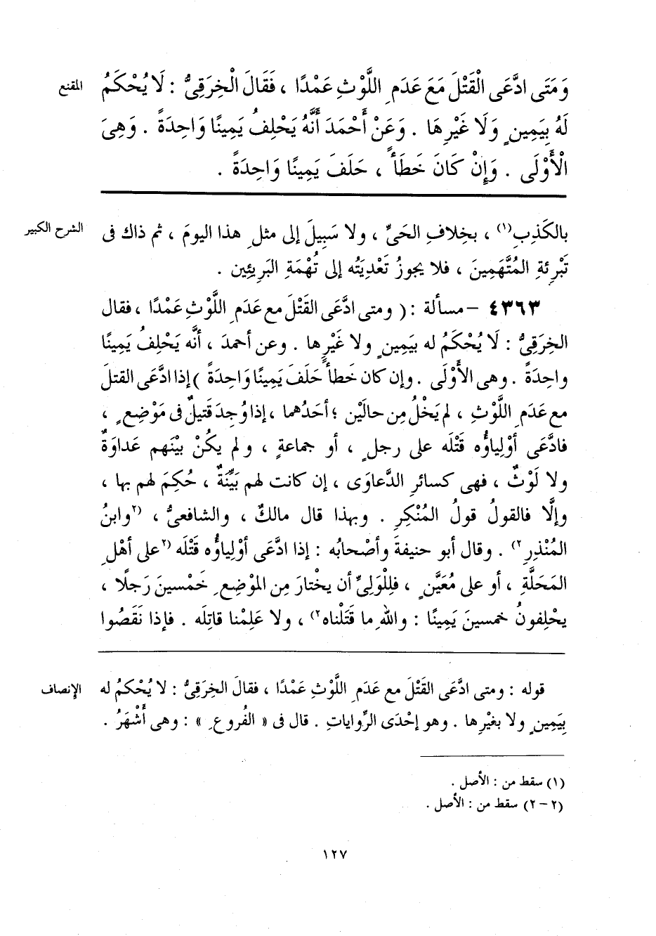 وَمَتَى ادَّعَى الْقَتْلَ مَعَ عَدَمِ اللَّوْثِ عَمْدًا، فَقَالَ الْخِرَقِىُّ: لَا يُحْكَمُ لَهُ بيَمِينٍ وَلَا غَيْرِهَا. وَعَنْ أَحْمَدَ أنَّهُ يَحْلِفُ يَمِينًا وَاحِدَةً. وَهِىَ الْأَولَى. وَإِنْ كَانَ خَطَأً، حَلَفَ يَمِينًا وَاحِدَةً.