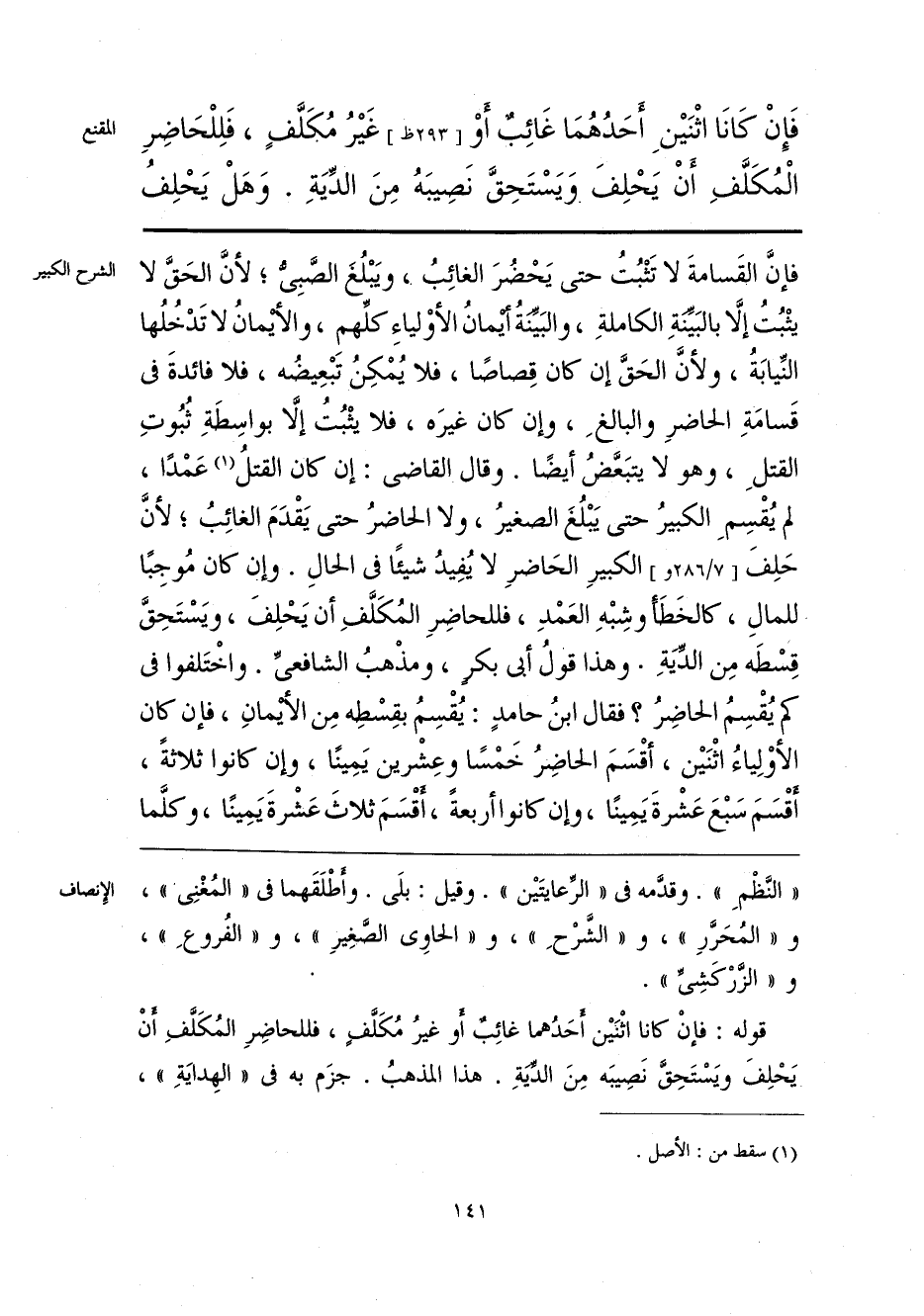 قوله: فإنْ كانا اثْنَيْن أَحَدُهما غائِبٌ أو غيرُ مُكَلَّفٍ، فللحاضِرِ المُكَلَّفِ أَنْ يَحْلِفَ ويَسْتَحِقَّ نَصِيبَه مِنَ الدِّيَةِ. هذا المذهبُ. جزَم به فى «الهِدايَةِ»،