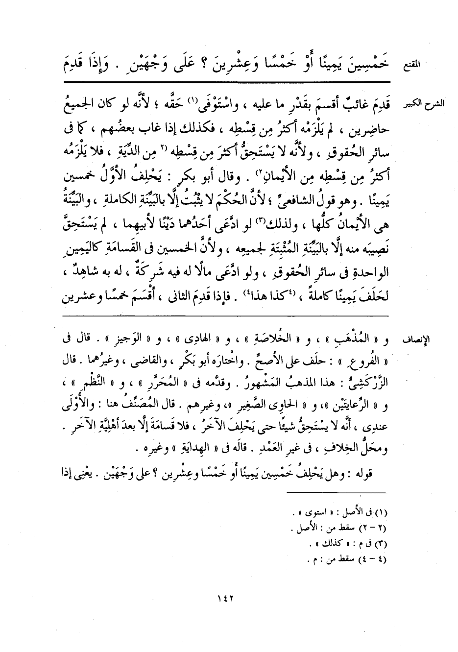 خَمْسِينَ يَمِينًا أَوْ خَمْسًا وَعِشْرِينَ؛ عَلَى وَجْهيْنِ. وَإِذَا قَدِمَ