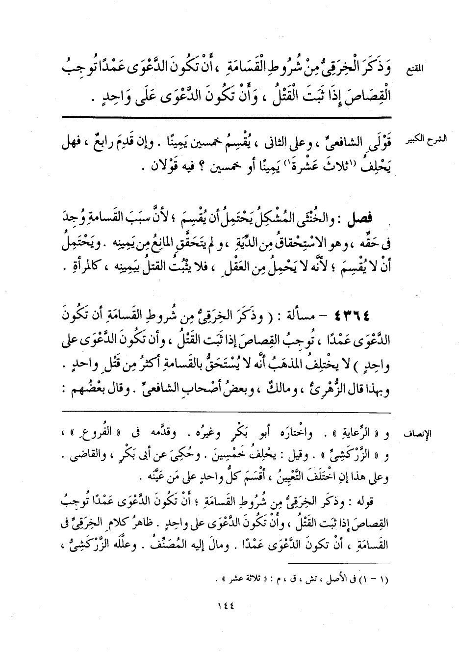 قوله: وذكَر الخِرَقِىُّ مِن شُرُوطِ القَسامَةِ؛ أَنْ تَكُونَ الدعوَى عَمدًا تُوجِبُ القِصاصَ إِذا ثبَت القَتْلُ، وأنْ تَكُونَ الدَّعْوَى على واحِدٍ. ظاهرُ كلامِ الخِرَقِىِّ فى القَسامَةِ، أَنْ تكونَ الدَّعْوَى عَمدًا. ومالَ إليه المُصَنِّفُ. وعلَّلَه الزَّرْكَشِىُّ،