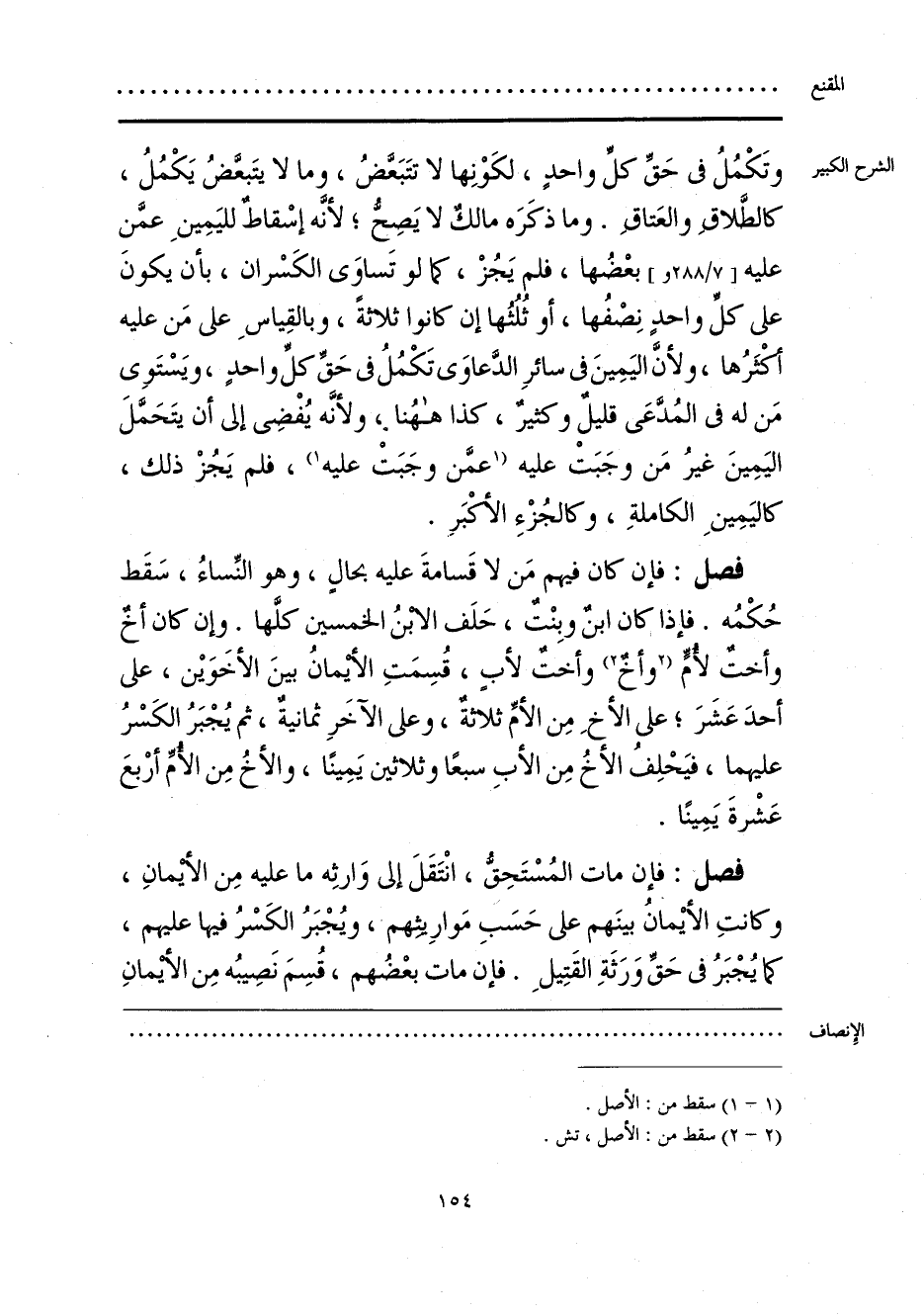 فصل: فإن كان فيهم مَن لا قَسامةَ عليه بحالٍ، وهو النَّساءُ، سَقَط حُكْمُه. فإذا كان ابنٌ وبِنْتٌ، حَلَف الابْنُ الخمسين كلَّها. وإن كان أخٌ وأختٌ لأُمٍّ [وأخٌ] (¬2) وأختٌ لأبٍ، قُسِمَتِ الأيْمانُ بينَ الأخَوَيْن، على أحدَ عَشَرَ؛ على الأخِ مِن الأمِّ ثلاثةٌ، وعلى الآخَرِ ثمانيةٌ، ثم يُجْبَرُ الكَسْرُ عليهما، فيَحْلِفُ الأخُ مِن الأبِ سبعًا وثلاثين يَمِينًا، والأخُ مِن الأُمِّ أرْبعَ عَشْرةَ يَمِينًا.