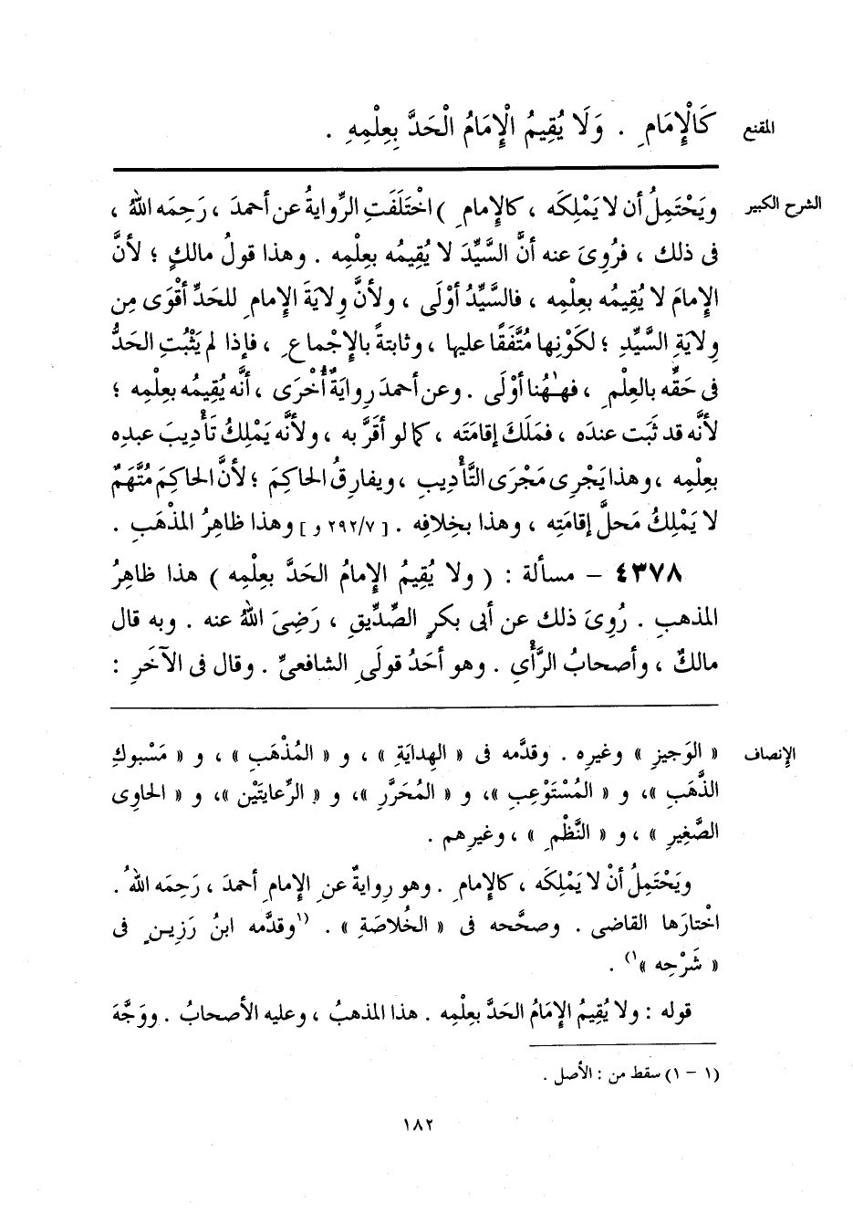 قوله: ولا يُقِيمُ الإِمَامُ الحَدَّ بعِلْمِه. هذا المذهبُ، وعليه الأصحابُ. ووَجَّه
