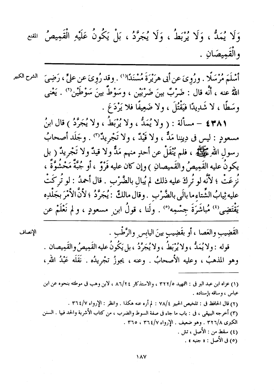وَلَا يُمَدُّ، وَلَا يُرْبَطُ، وَلَا يُجَرَّدُ، بَلْ يَكُونُ عَلَيْهِ الْقَمِيصُ والْقَمِيصَانِ.
