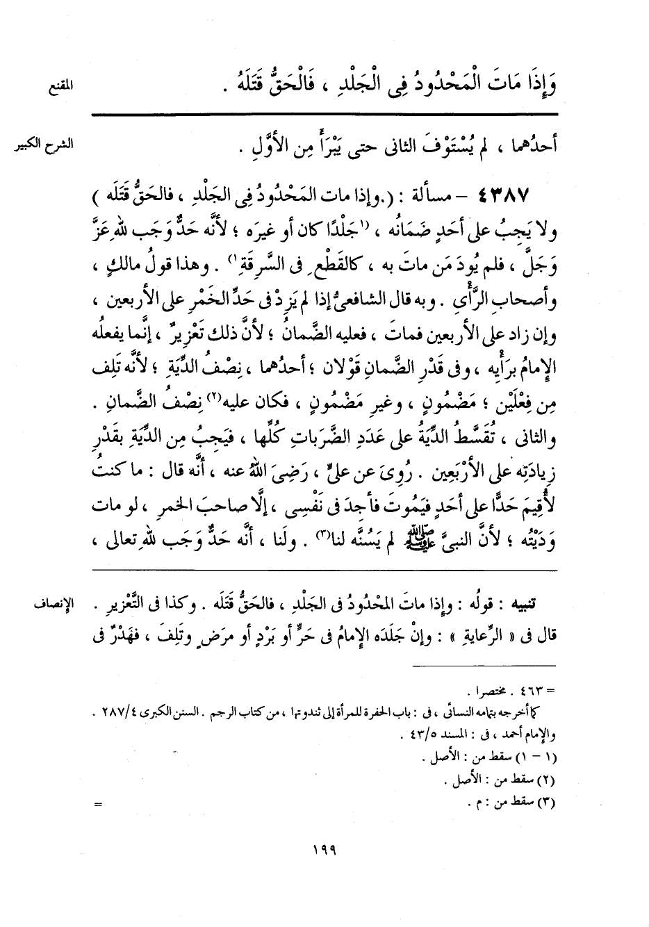 تنبيه: قولُه: وإذا ماتَ المحْدُودُ فى الجَلْدِ، فالحَقُّ قَتَلَه. وكذا فى التَّعْزيرِ. قال فى «الرِّعايَةِ»: وإنْ جَلَدَه الإِمامُ فى حَرٍّ أو بَرْدٍ أو مرَضٍ وتَلِفَ، فَهَدْرٌ فى