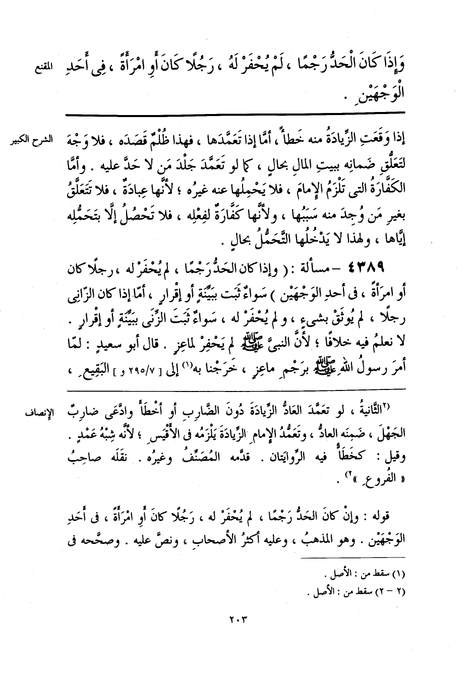 وَإِذَا كَانَ الْحَدُّ رَجْمًا، لَمْ يُحْفَرْ لَهُ، رَجُلًا كَانَ أَوْ امْرَأَةً، فِى أَحَدِ الْوَجْهَيْنَ.