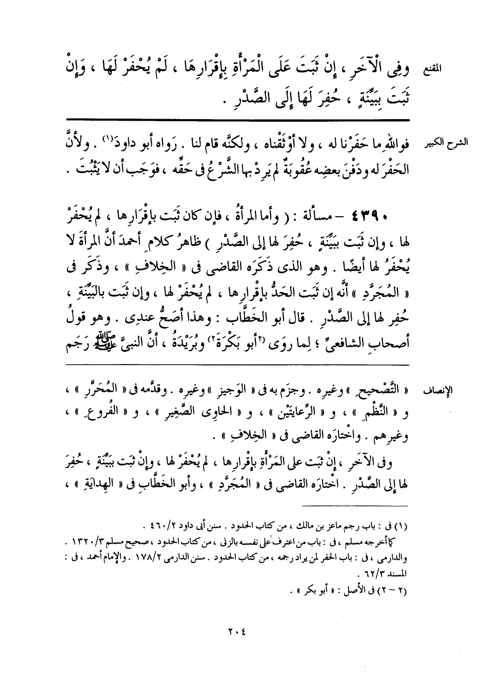 وفى الآخَرِ، إنْ ثبَت على المَرْأةِ بإِقْرارِها، لم يُحْفَرْ لها، وإنْ ثبَت ببَيِّنَةٍ، حُفِرَ لها إلى الصَّدْرِ. اخْتارَه القاضى فى «المُجَرَّدِ»، وأبو الخَطَّابِ فى «الهِدايَةِ»،