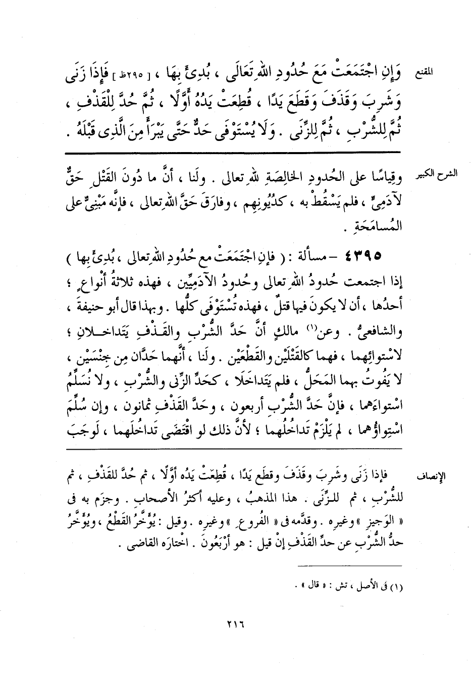فإذا زَنَى وشَرِبَ وقَذَفَ وقطَع يَدًا، قُطِعتْ يَدُه أوَّلًا، ثم حُدَّ للقَذْفِ، ثم للشُرْبِ، ثم للزِّنَى. هذا المذهبُ، وعليه أكثرُ الأصْحابِ. وجزَم به فى «الوَجيزِ» وغيرِه. وقدَّمه فى «الفُروعِ» وغيرِه. وقيل: يُؤخَّرُ القَطْعُ، ويُؤخَّرُ حدُّ الشُّرْبِ عن حدِّ القَذْفِ إنْ قيل: هو أرْبَعُونَ. اخْتارَه القاضى.