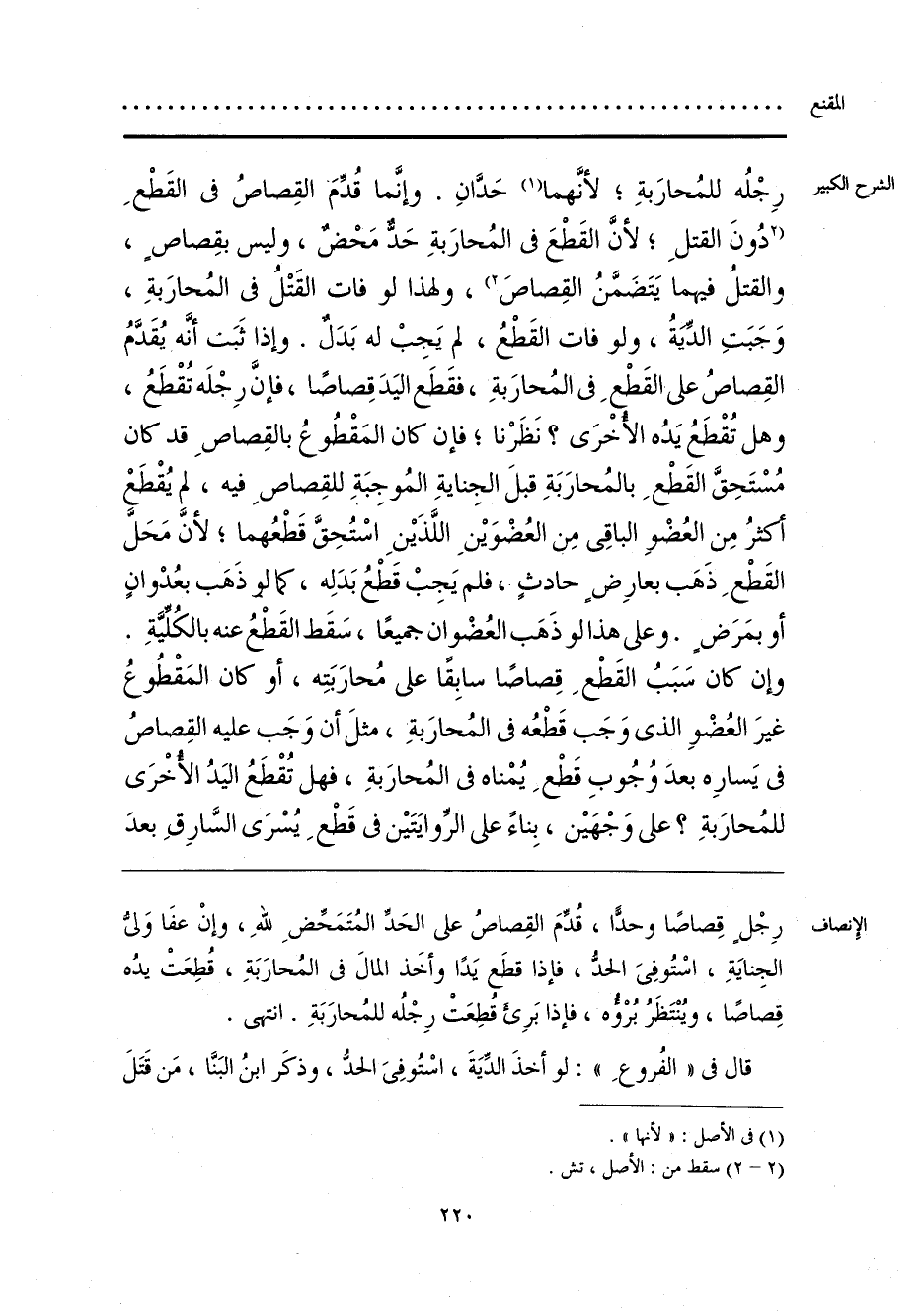 رِجْلٍ قِصاصًا وحدًّا، قُدِّمَ القِصاصُ على الحَدِّ المُتَمَحِّضِ للَّهِ، وإنْ عفَا وَلىُّ الجِنايَةِ، اسْتُوفِىَ الحدُّ، فإذا قطَع يَدًا وأخَذ المالَ فى المُحارَبَةِ، قُطِعَتْ يدُه قِصاصًا، ويُنْتَظَرُ بُرْؤُه، فإذا بَرِئ قُطِعَتْ رِجْلُه للمُحارَبَةِ. انتهى.