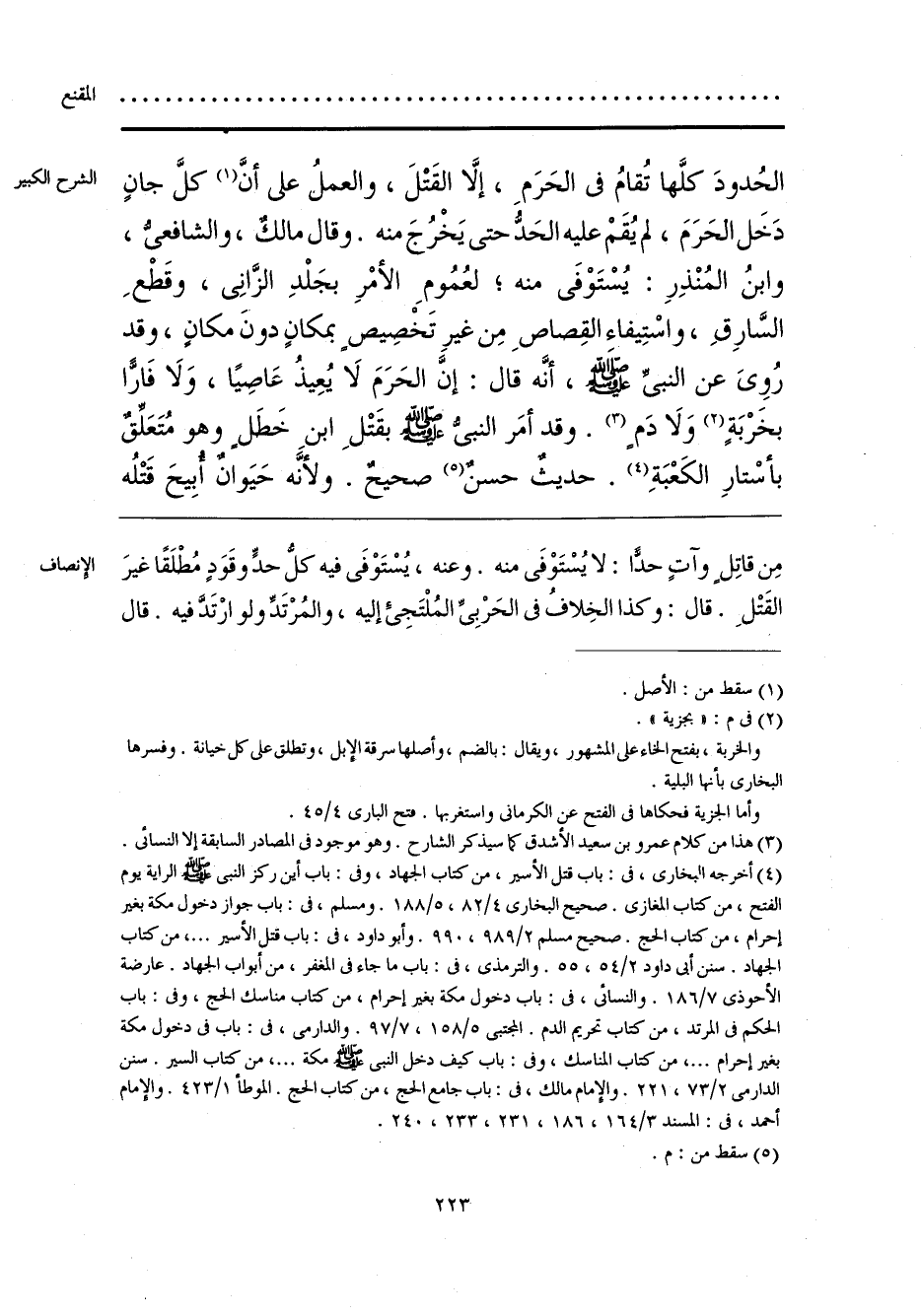 مِن قاتِلٍ وآتٍ حدًّا: لا يُسْتَوْفَى منه. وعنه، يُسْتَوْفَى فيه كلُّ حدٍّ وقَوَدٍ مُطْلَقًا غيرَ القَتْلِ. قال: وكذا الخِلافُ فى الحَرْبِىِّ المُلْتَجِئ إليه، والمُرْتَدِّ ولو ارْتَدَّ فيه. قال