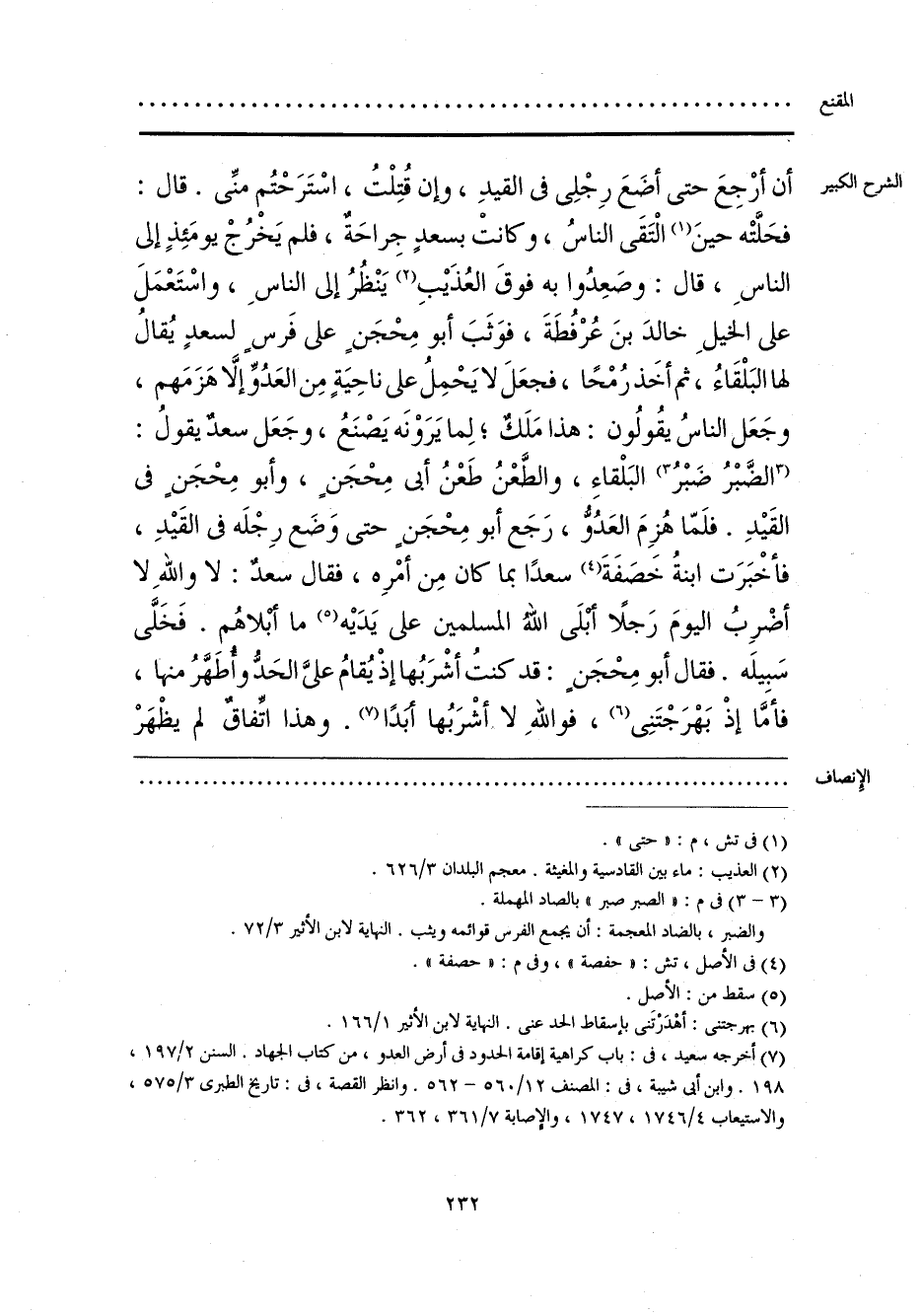 أن أرْجِعَ حتى أضَعَ رِجْلِى في القيدِ، وإن قُتِلْتُ، اسْتَرَحْتُم منِّى. قال: فحَلَّتْه حينَ (¬1) الْتَقَى الناسُ، وكانتْ بسعدٍ جِراحَةٌ، فلم يَخرُجْ يومَئِذٍ إلى الناسِ، قال: وصَعِدُوا به فوقَ العُذَيْبِ (¬2) يَنْظُرُ إلى الناسِ، واسْتَعْمَلَ على الخيلِ خالدَ بنَ عُرْفُطَةَ، فوَثَبَ أبو مِحْجَنٍ على فَرسٍ لسعدٍ يُقالُ لها البَلْقَاءُ، ثم أخَذ رُمْحًا، فجعَلَ لا يَحْمِلُ على ناحِيَةٍ مِن العَدُوِّ إلَّا هَزَمَهم، وجَعَل الناسُ يقُولُون: هذا مَلَكٌ؛ لِما يَرَوْنَه يَصْنَعُ، وجَعَل سعدٌ يقولُ: [الضَّبْرُ ضَبْرُ] (¬3) البَلْقاءِ، والطَّعْنُ طَعْنُ أبى مِحْجَنٍ، وأبو مِحْجَنٍ في القَيْدِ. فلَمّا هُزِمَ العَدُوُّ، رَجَع أبو مِحْجَنٍ حتى وَضَع رِجْلَه في القَيْدِ، فأخْبَرَت ابنةُ خَصَفَةَ (¬4) سعدًا بما كان مِن أمْرِه، فقال سعدٌ: لا واللَّهِ لا أضْرِبُ اليومَ رَجلًا أبْلَى اللَّهُ المسلمين على يَدَيْه (¬5) ما أبْلاهُم. فَخَلَّى سَبيلَه. فقال أبو مِحْجَنٍ: قد كنتُ أشْرَبُها إذْ يُقامُ علىَّ الحَدُّ وأُطَهَّرُ منها، فأمَّا إذْ بَهْرَجْتَنِى (¬6)، فواللَّهِ لا أشْرَبُها أبدًا (¬7). وهذا اتِّفاقٌ لم يظْهَرْ