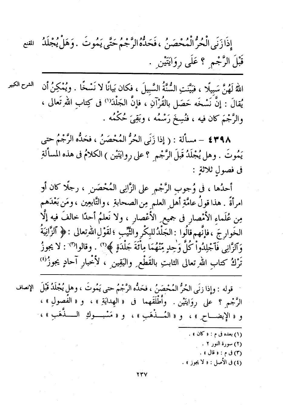 إِذَا زَنَى الْحُرُّ الْمُحْصَنُ، فَحَدُّهُ الرَّجْمُ حَتَّى يَمُوتَ. وَهَلْ يُجْلَدُ قَبْلَ الرَّجْمَ؟ عَلَى رِوَايَتَين.