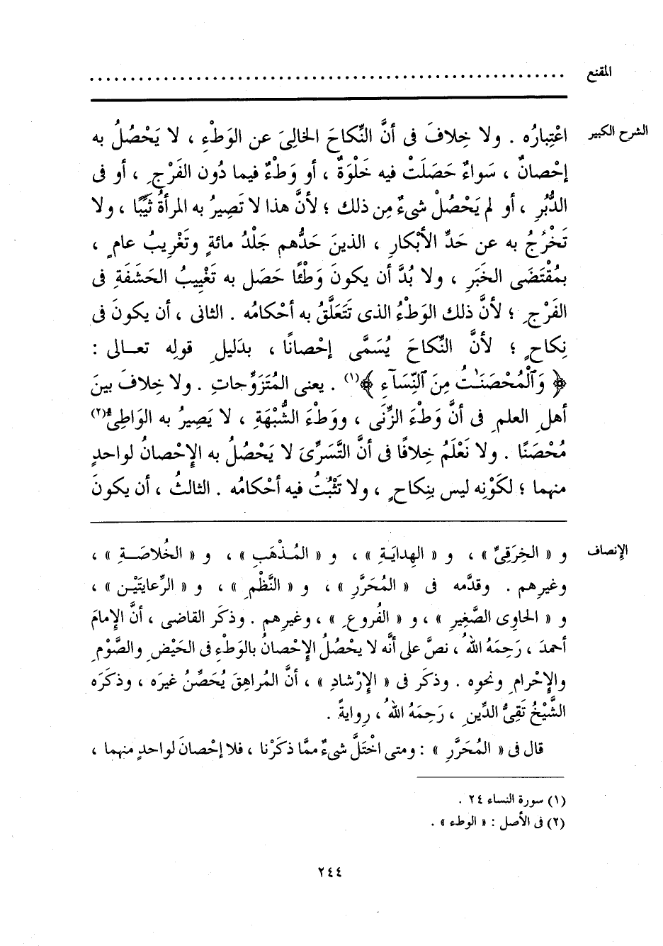 و «الخِرَقِىِّ»، و «الهِدايَةِ»، و «المُذْهَبِ»، و «الخُلاصَةِ»، وغيرِهم. وقدَّمه فى «المُحَرَّرِ»، و «النَّظْمِ»، و «الرِّعايتَيْن»، و «الحاوِى الصَّغِيرِ»، و «الفُروعِ»، وغيرِهم. وذكَر القاضى، أنَّ الإِمامَ أحمدَ، رَحِمَهُ اللَّهُ، نصَّ على أنَّه لا يحْصُلُ الإِحْصانُ بالوَطْءِ فى الحَيْضِ والصَّوْمِ والإحْرامِ ونحوِه. وذكَر فى «الإِرْشادِ»، أنَّ المُراهِقَ يُحَصِّنُ غيرَه، وذكَرَه الشَّيْخُ تَقِىُّ الدِّينِ، رَحِمَهُ اللَّهُ، رِوايةً.