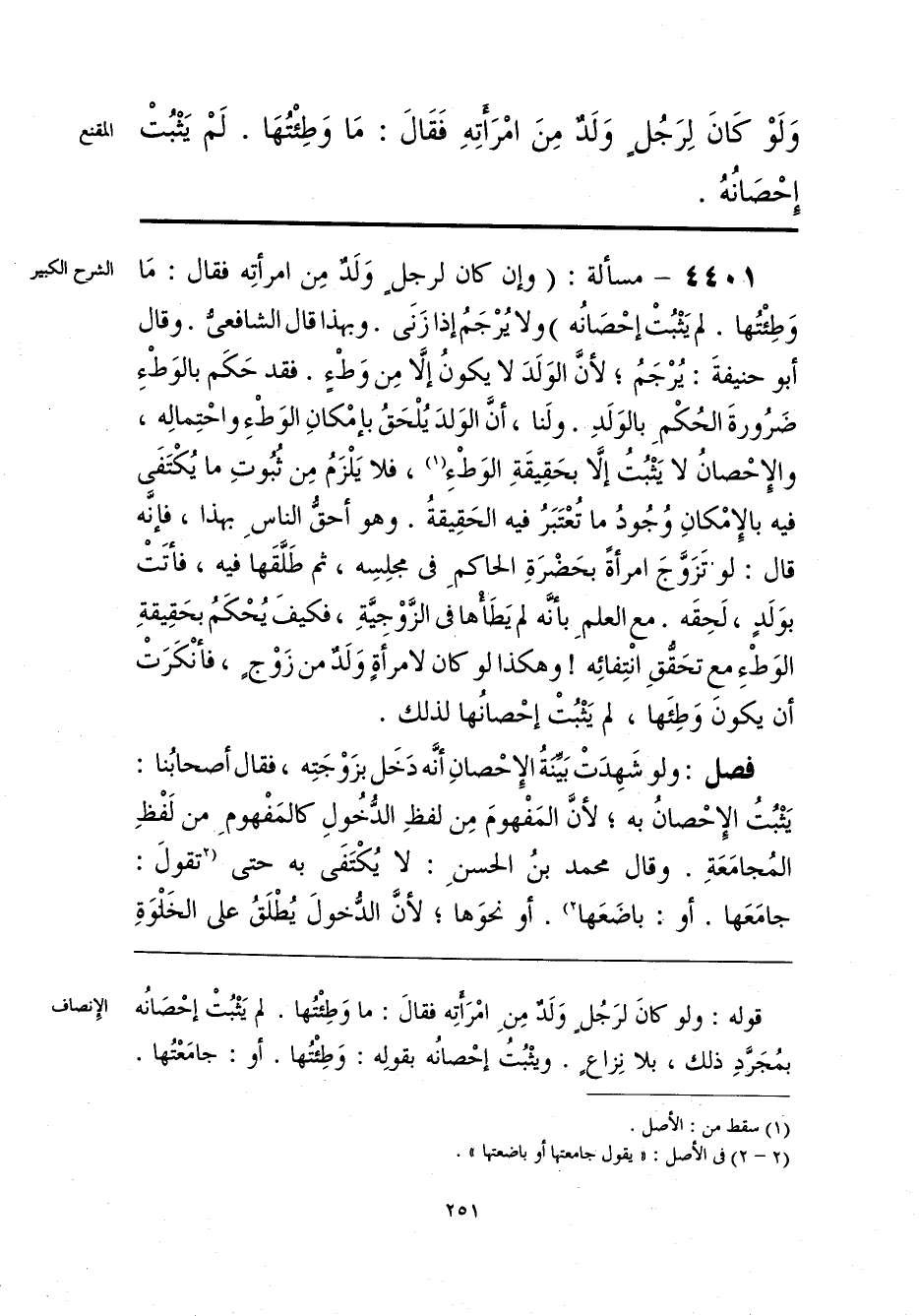 قوله: ولو كانَ لرَجُلٍ وَلَدٌ مِنِ امْرأتِه فقالَ: ما وَطِئْتُها. لم يَثْبُتْ إحْصَانُه بمُجَرَّدِ ذلك، بلا نِزاعٍ. ويثْبُتُ إحْصانُه بقولِه: وَطِئْتُها. أو: جامَعْتُها.