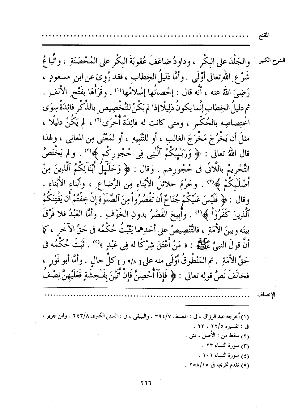 والجَلْدَ على البِكْرِ، وداودُ ضاعَفَ عُقوبَةَ البِكْرِ على المُحْصَنَةِ، واتِّباعُ شَرْعِ اللَّهِ تعالى أوْلَى. وأمَّا دَليلُ الخِطابِ، فقد رُوِى عن ابنِ مسعودٍ، رَضِىَ اللَّهُ عنه، أنَّه قال: إحْصانُها إسْلامُها (¬1). وقَرَأَهَا بفَتْحِ الألفِ. ثم دليلُ الخِطابِ إنَّما يكونُ دَلِيلًا إذا لم يَكُنْ للتَّخْصِيصِ بالذِّكْرِ فائِدَةٌ سِوَى اخْتِصاصِه بالحُكْمِ، ومتى كانت له فائِدَةٌ أُخرَى (¬2)، لم يَكُنْ دليلًا، مثلَ أن يَخْرُجَ مَخْرَجَ الغالبِ، أو للتَّنْبِيهِ، أو لمَعْنًى مِن المعانِى، ولهذا قال اللَّهُ تعالى: {وَرَبَائِبُكُمُ الَّتِى فِي حُجُورِكُمْ} (3). ولم يَختَصَّ التَّحْرِيمُ باللَّائى في حُجُورِهم. ؤقال: {وَحَلَائِلُ أَبْنَائِكُمُ الَّذِينَ مِنْ أَصْلَابِكُمْ} (¬3). وحَرُمَ حلائلُ الأبناءِ مِن الرَّضاعَ، وأَبْناء الأبناءِ. وقال: {فَلَيْسَ عَلَيْكُمْ جُنَاحٌ أَنْ تَقْصُرُوا مِنَ الصَّلَاةِ إِنْ خِفْتُمْ أَنْ يَفْتِنَكُمُ الَّذِينَ كَفَرُوا} (¬4). وأُبِيحَ القَصْرُ بدونِ الخَوْفِ. وأمَّا العَبْدُ فلا فَرْق بينَه وبينَ الأمَةِ، فالتَّنْصِيصُ على أحَدِهما يَثْبُتُ حُكْمُه في حَقِّ الآخَرِ، كما أنَّ قولَ النبىِّ -صلى اللَّه عليه وسلم-: «مَنْ أعْتَقَ شِرْكًا له في عَبْدٍ» (¬5). ثَبَتَ حُكْمُه في حَقِّ الأمَةِ. ثم المَنْطُوقُ أوْلَى منه على كلِّ حالٍ. وأمَّا أبو ثَوْرٍ، فخالَفَ نَصَّ قولِه تعالى: {فَإِذَا أُحْصِنَّ فَإِنْ أتَيْنَ بِفَاحِشَةٍ فَعَلَيْهِنَّ نِصْفُ