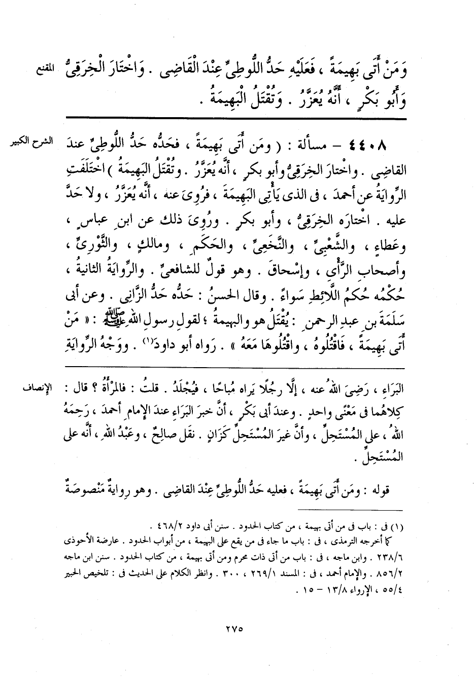 وَمَنْ أَتَى بَهِيمَةً، فَعَلَيْهِ حَدُّ اللُّوطِىِّ عِنْدَ الْقَاضِى. وَاخْتَارَ الْخِرَقِىُّ وَأَبُو بَكْرٍ، أَنَّهُ يُعَزَّرُ. وَتُقْتَلُ الْبَهِيمَةُ.