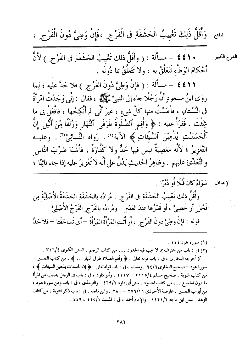 وأَقَلُّ ذلك تَغْيِيبُ الحَشَفَةِ فى الفَرْجِ. مُرادُه بالحَشَفَةِ الحَشَفَةُ الأصْلِيَّةُ مِن فَحْلٍ أو خَصِىٍّ، أو قَدْرُها عندَ العَدَمِ. ومُرادُه بالفَرْجِ الفَرْجُ الأَصْلِىُّ.