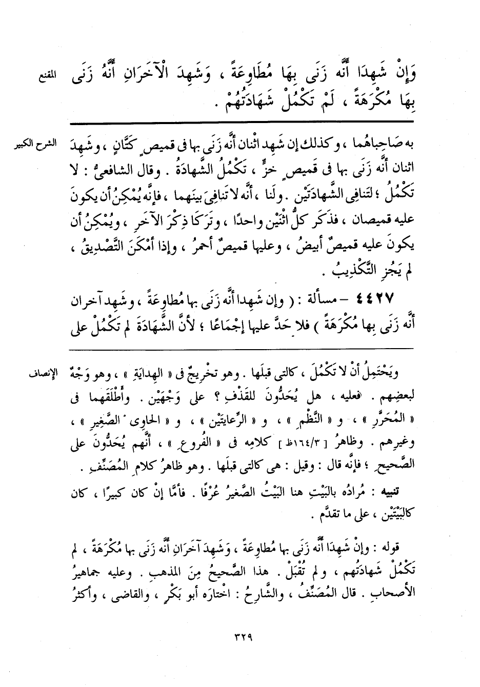 قوله: وإنْ شَهِدَا أنَّه زَنَى بها مُطاوِعَةً، وَشَهِدَ آخَرَانِ أنَّه زَنَى بها مُكْرَهَةً، لم تَكْمُلْ شَهادَتُهم، ولم تُقْبَلْ. هذا الصَّحيحُ مِنَ المذهبِ. وعليه جماهيرُ الأصحابِ. قال المُصَنِّفُ، والشَّارِحُ: اخْتارَه أبو بَكْرٍ، والقاضى، وأكثرُ