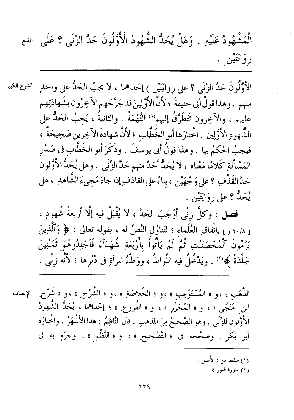الذَّهَبِ»، و «المُسْتَوْعِبِ»، و «الخُلاصَةِ»، و «الشَّرْحِ»، و «شَرْحِ ابنِ مُنَجَّى»، و «المُحَرَّرِ»، و «الفُروعِ»؛ إحْداهما، يُحَدُّ الشُّهودُ الأوَّلون للزِّنَى. وهو الصَّحيحُ مِنَ المذهبِ. قال النَّاظِمُ: هذا الأشْهَرُ. واخْتارَه أبو بَكْرٍ. وصحَّحه فى «التَّصْحيحِ»، و «النَّظْمِ». وجزَم به فى