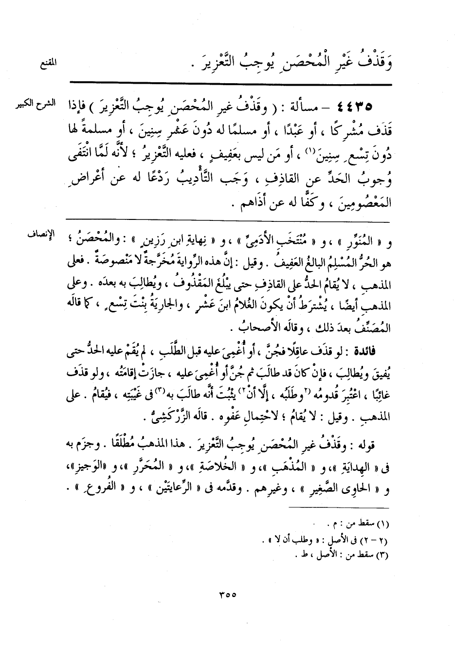 و «المُنَوِّرِ»، و «مُنْتَخَبِ الأدَمِىِّ»، و «نِهايةِ ابنِ رَزِينٍ»: والمُحْصَنُ؛ هو الحُرُّ المُسْلِمُ البالغُ العَفِيفُ. وقيل: إنَّ هذه الرِّوايةَ مُخَرَّجة لا مَنْصوصَةٌ. فعلى المذهبِ، لا يُقامُ الحدُّ على القاذِفِ حتى يبْلُغَ المَقْذُوفُ، ويُطالِبَ به بعدَه. وعلى المذهبِ أيضًا، يُشْترَطُ أَنْ يكونَ الغُلامُ ابنَ عَشْرٍ، والجارِيَةُ بِنْتَ تِسْعٍ، كما قالَه المُصَنِّفُ بعدَ ذلك، وقالَه الأصحابُ.
