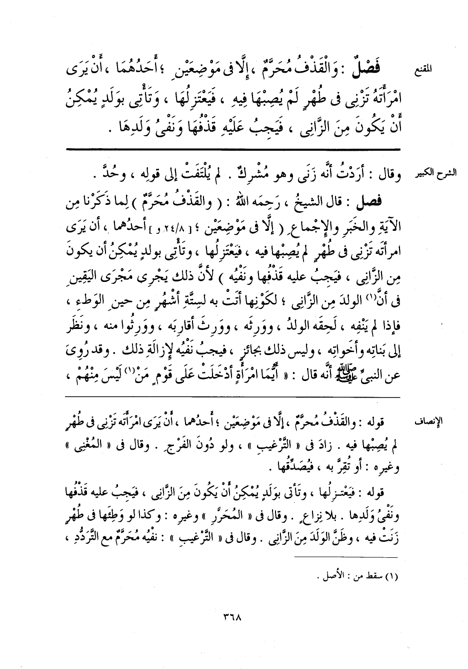 فَصْلٌ: وَالْقَذْفُ مُحَرَّمٌ، إلَّا فى مَوْضِعَيْنِ، أَحَدُهُمَا، أَنْ يَرَى امْرأَتَهُ تَزْنِى فى طُهْرِ لَمْ يُصِبْهَا فِيهِ، فَيَعْتَزِلُهَا، وَتَأْتِى بوَلَدٍ يُمْكِنُ أَنْ يَكُونَ مِنَ الزَّانِى، فَيَجِبُ عَلَيْهِ قَذْفُهَا وَنَفْىُ وَلَدِهَا.