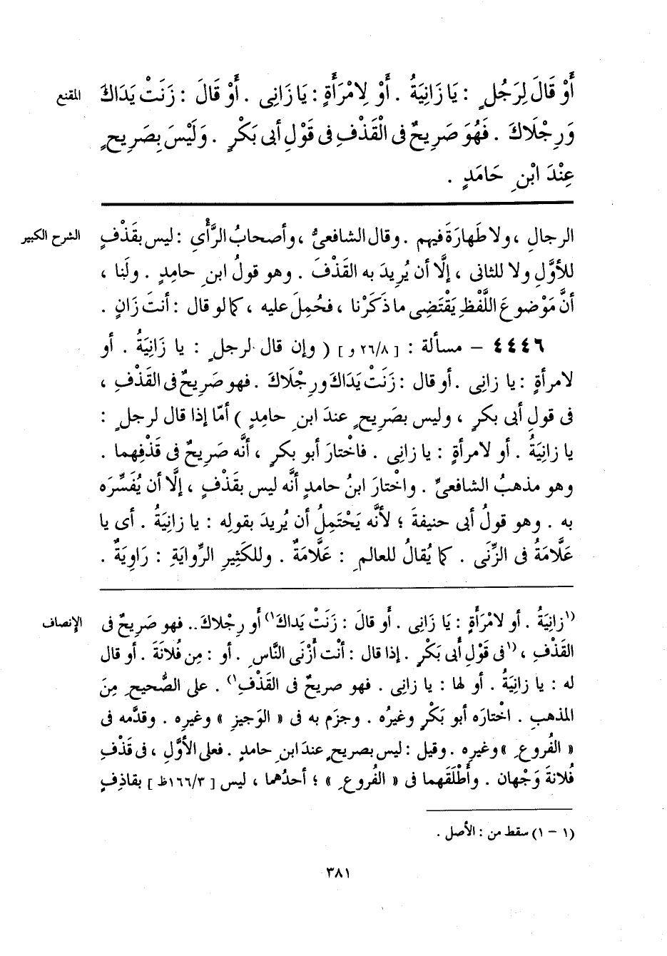 أَوْ قَالَ لِرَجُلٍ: يَا زَانِيَةُ. أَوْ لِامْرأةٍ: يَا زَانِى. أَوْ قَالَ: زَنَتْ يَدَاكَ وَرِجْلَاكَ. فَهُوَ صَرِيحٌ فى الْقَذْفِ فى قَوْلِ أبى بَكْرٍ. وَلَيْسَ بِصَرِيحٍ عِنْدَ ابْنِ حَامَدٍ.