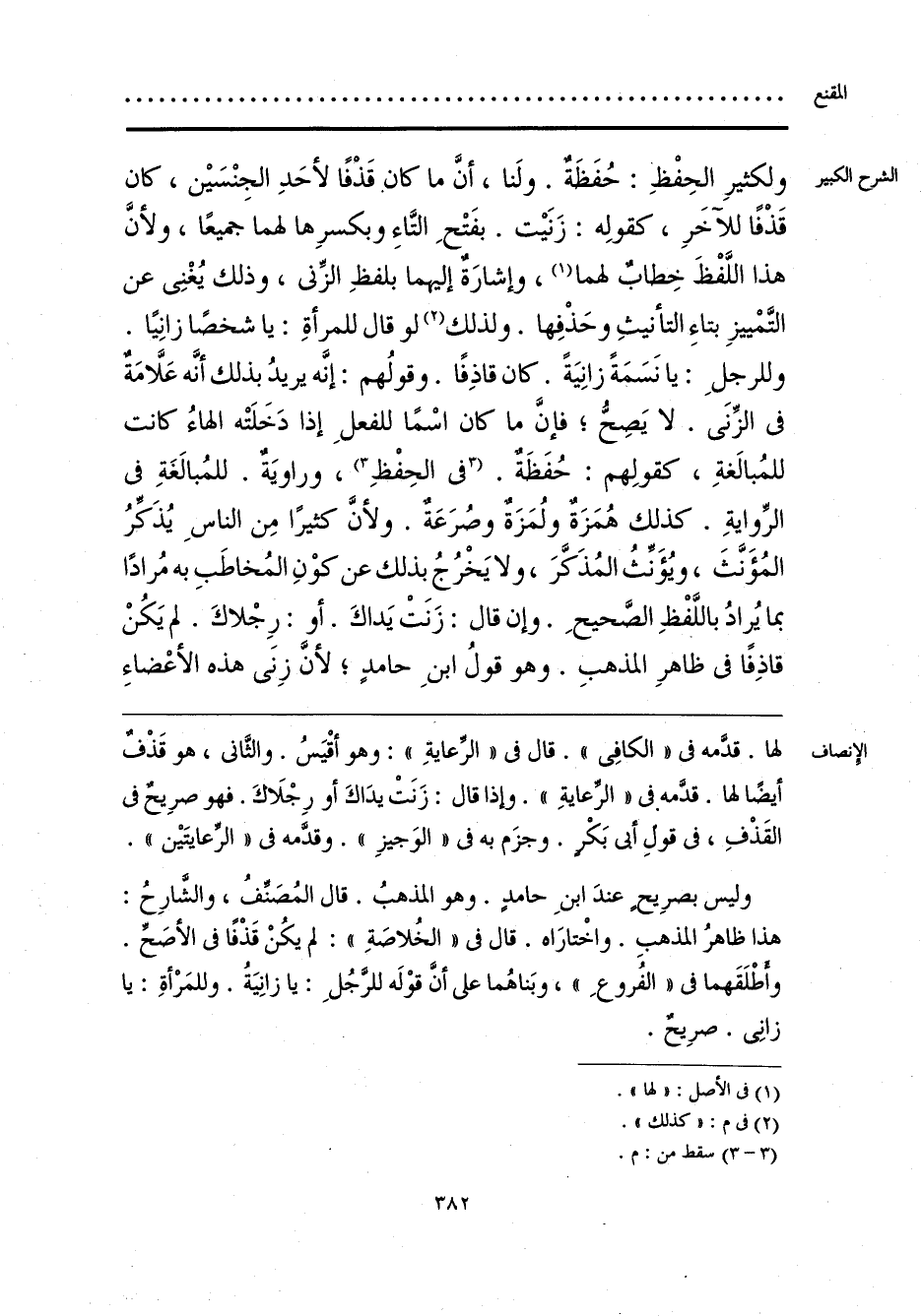 وليس بصرِيحٍ عندَ ابنِ حامدٍ. وهو المذهبُ. قال المُصَنِّفُ، والشَّارِحُ: هذا ظاهرُ المذهبِ. واخْتارَاه. قال فى «الخُلاصَةِ»: لم يكُنْ قَذْفًا فى الأصَحِّ. وأَطْلَقَهما فى «الفُروعِ»، وبَناهُما على أنَّ قوْلَه للرجُلِ: يا زانِيَةُ. وللمَرْأةِ: يا زانِى. صرِيحٌ.
