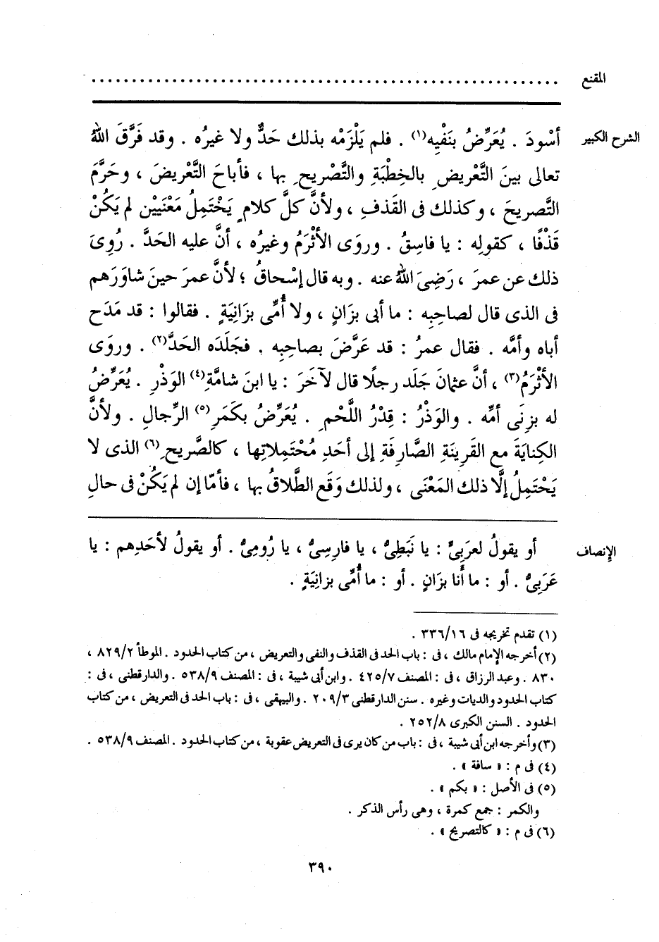 أو يقولُ لعرَبِىٍّ: يا نَبَطِى، يا فارِسِىُّ، يا رُومِىُّ. أو يقولُ لأحَدِهم: يا عَرَبِىُّ. أو: ما أنا بزَانٍ. أو: ما أُمِّى بزانِيَةٍ.