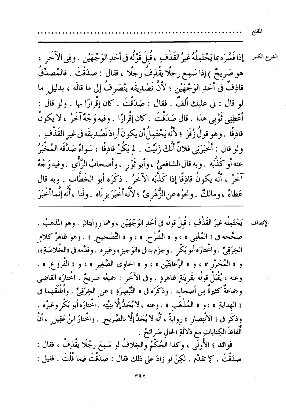 يَحْتَمِلُه غيرَ القَذْفِ، قُبِلَ قولُه فى أحَدِ الوَجْهَيْن، وهما رِوايَتانِ. وهو المذهبُ. صحَّحه فى «المُغْنِى»، و «الشَّرْحِ»، و «التَّصْحيحِ». وهو ظاهرُ كلامِ الخِرَقِىِّ. واخْتارَه أبو بَكْرٍ. وجزَم به فى «الوَجيزِ» وغيرِه. وقدَّمه فى «الخُلاصَةِ»، و «المُحَرَّرِ»، و «الرِّعايتَيْن»، و «الحاوِى الصَّغِيرِ»، و «الفُروعِ». وعنه، يُقْبَلُ قولُه بقَرِينَةٍ ظاهرةٍ. وفى الآخَرِ: جميعُه صريحٌ. اخْتارَه القاضى وجماعةٌ كثيرة مِن أصحابِه. وذكَرَه فى «التَّبْصِرَةِ» عنِ الخِرَقِىِّ. وأَطْلَقَهما فى «الهِدايَةِ»، و «المُذْهَبِ». وعنه، لا يُحَدُّ إلّا بنِيَّتِه. اخْتارَه أبو بَكْرٍ وغيرُه. وذكَر فى «الانْتِصارِ» رِوايةً، أنَّه لا يُحَدُّ إلَّا بالصَّريحِ. واخْتارَ ابنُ عَقِيلٍ، أنَّ أَلْفاظَ الكِناياتِ مع دَلالَةِ الحالِ صَرائحُ.