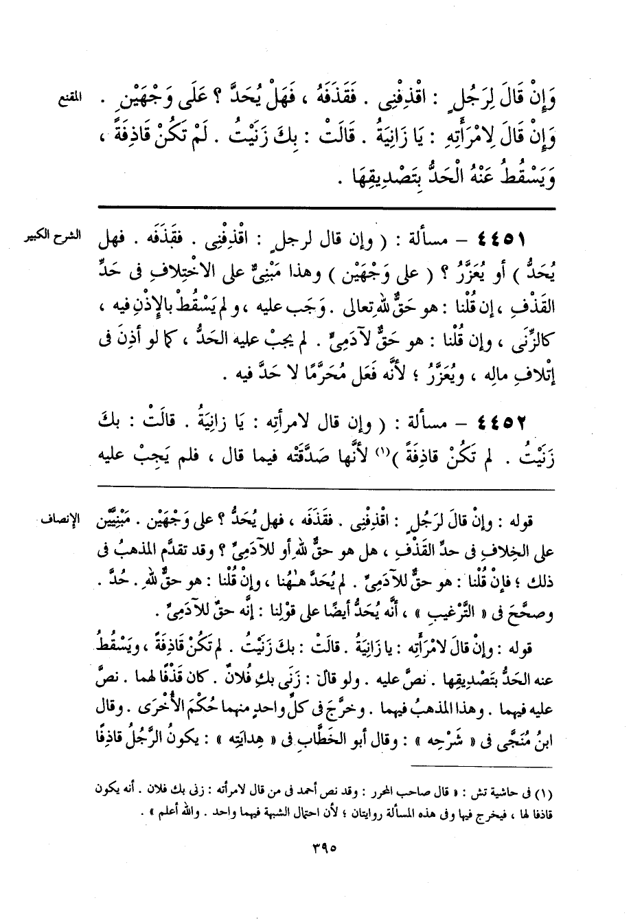 قوله: وإنْ قالَ لامْرَأتِه: يا زَانِيَةُ. قالَتْ: بكَ زَنَيْتُ. لم تَكُنْ قَاذِفَةً، ويَسْقُطُ عنه الحَدُّ بتَصْدِيقِها. نصَّ عليه. ولو قال: زَنَى بكِ فُلانٌ. كان قَذْفًا لهما. نصَّ عليه فيهما. وهذا المذهبُ فيهما. وخرَّجَ فى كلِّ واحدٍ منهما حُكْمَ الأُخْرَى. وقال ابنُ مُنَجَّى فى «شَرْحِه»: وقال أبو الخَطَّابِ فى «هِدايَتِه»: يكونُ الرَّجُلُ قاذِفًا