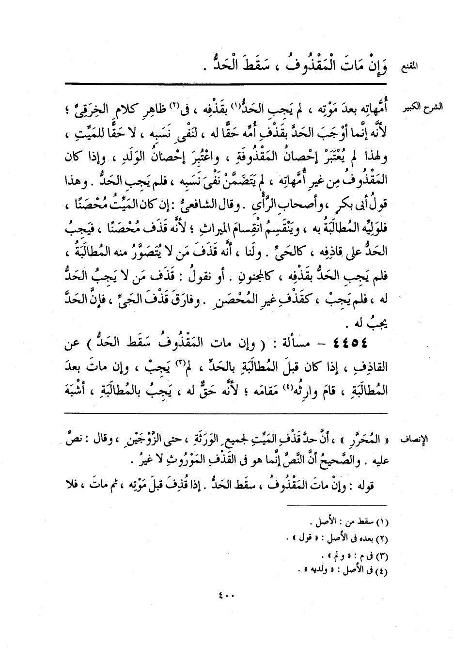 «المُحَرَّرِ»، أنَّ حدَّ قَذْفِ المَيِّتِ لجميعِ الوَرَثَةِ، حتى الزَّوْجَيْنِ، وقال: نصَّ عليه. والصَّحيحُ أنَّ النَّصَّ إنَّما هو فى القَذْفِ المَوْرُوثِ لا غيرُ.