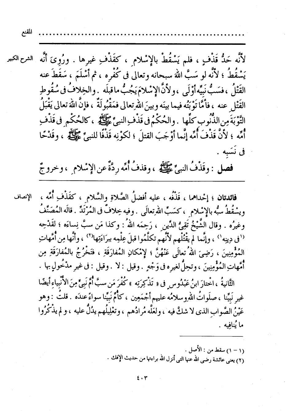 فائدتان؛ إحْداهما، قذْفُه، عليه أفضلُ الصَّلاةِ والسَّلامِ، كقَذْفِ أُمِّه، ويسْقُطُ سبُّه بالإِسْلامِ، كسَبِّ اللَّهِ تعالَى. وفيه خِلافٌ فى المُرْتَدِّ. قالَه المُصَنِّفُ وغيرُه. وقال الشَّيْخُ تَقِىُّ الدِّينِ، رَحِمَه اللَّهُ: وكذا مَن سبَّ نِساءَه؛ لقَدْحِه [فى دِينه] (¬1)، وإنَّما لم يقْتُلْهم لأنهم تكلَّمُوا قبلَ عِلْمِه ببرَاءَتها (¬2)، وأنَّها مِن أُمَّهاتِ المُؤْمِنِينَ، رَضِىَ اللَّهُ تعالَى عَنْهُنَّ؛ لإمْكانِ المُفارَقَةِ، فتَخْرُجُ بالمُفارَقَةِ مِن أُمَّهاتِ المُؤمِنِينَ، وتحِلُّ لغيرِه فى وَجْهٍ. وقيل: لا. وقيل: فى غيرِ مدْخُولٍ بها.