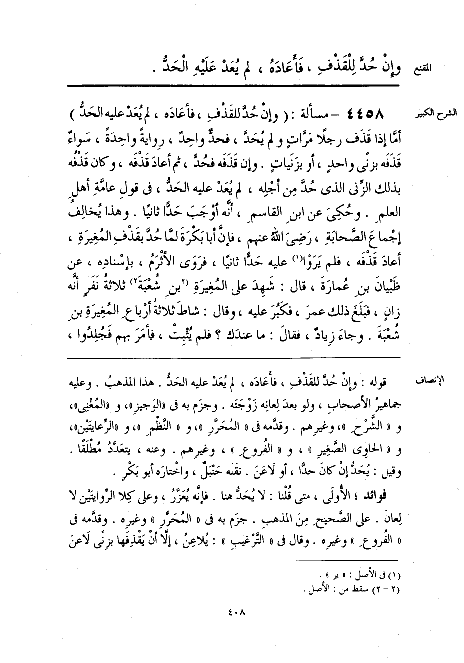 قوله: وِإنْ حُدَّ للقَذْفِ، فأعَادَه، لم يُعَدْ عليه الحَدُّ. هذا المذهبُ. وعليه جماهيرُ الأصحابِ، ولو بعدَ لِعانِه زَوْجَتَه. وجزَم به فى «الوَجيزِ»، و «المُغْنِى»، و «الشَّرْحِ»، وغيرِهم. وقدَّمه فى «المُحَرَّرِ»، و «النَّظْمِ»، و «الرِّعايتَيْن»، و «الحاوِى الصَّغِيرِ»، و «الفُروعِ»، وغيرِهم. وعنه، يتعَدَّدُ مُطْلَقًا. وقيل: يُحَدُّ إنْ كانَ حدًّا، أو لَاعَنَ. نقَلَه حَنْبَلٌ، واخْتارَه أبو بَكْرٍ.
