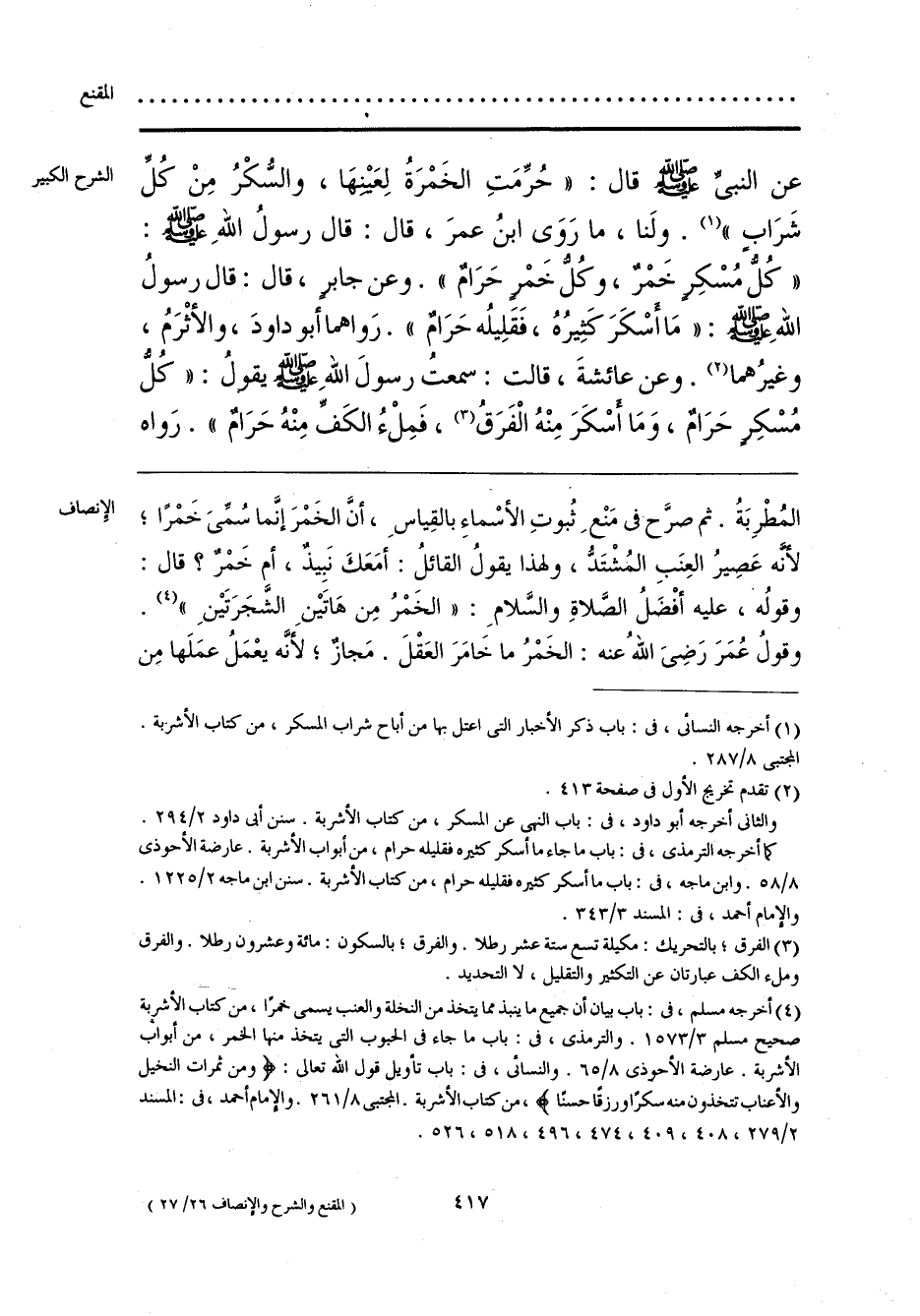 (¬1) أخرجه مسلم، فى: باب بيان أن جميع ما ينبذ مما يتخذ من النخلة والعنب يسمى خمرًا، من كتاب الأشربة صحيح مسلم 3/ 1573. والترمذى، فى: باب ما جاء فى الحبوب التى يتخذ منها الخمر، من أبواب الأشربة. عارضة الأحوذى 8/ 65. والنسائى، فى: باب تأويل قول اللَّه تعالى: {وَمِنْ ثَمَرَاتِ النَّخِيلِ وَالْأَعْنَابِ تَتَّخِذُونَ مِنْهُ سَكَرًا وَرِزْقًا حَسَنًا}، من كتاب الأشربة. المجتبى 8/ 261. والإمام أحمد، فى: المسند 2/ 279، 408، 409، 474، 496، 518، 526.