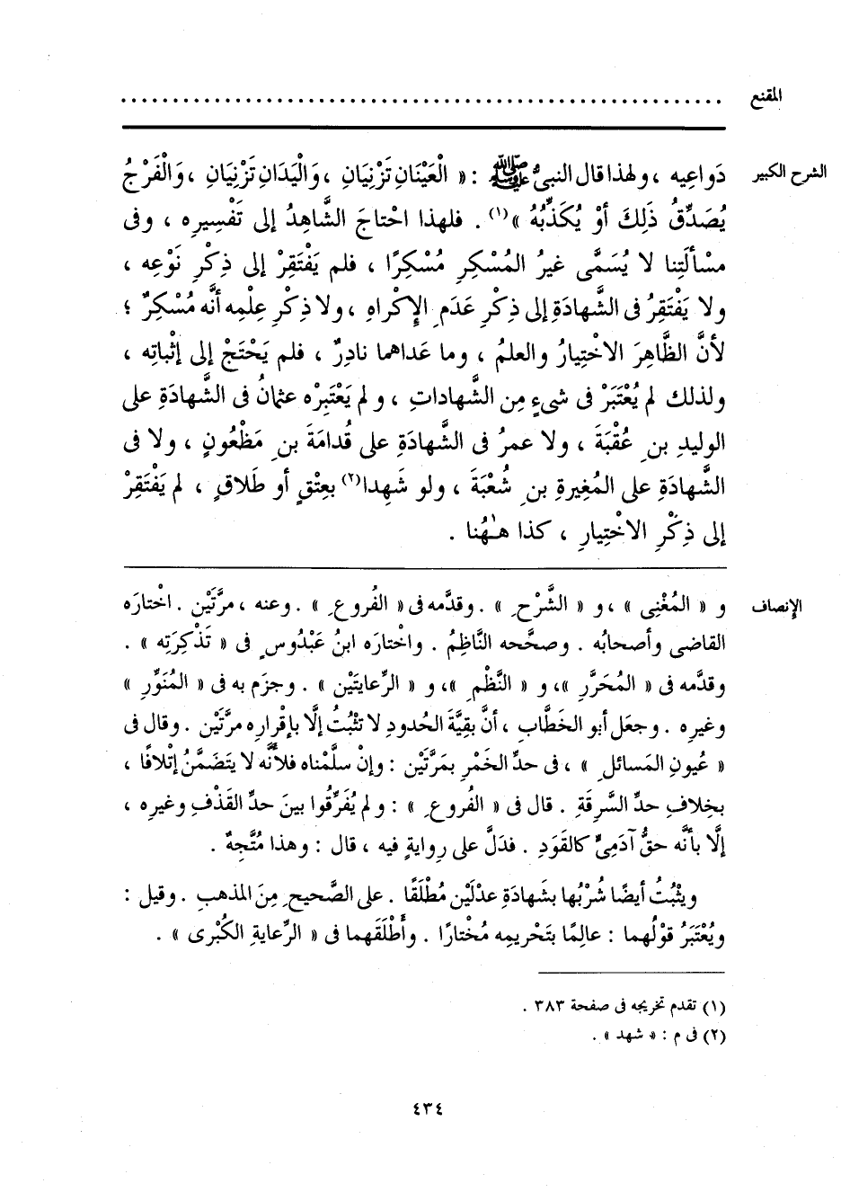 و «المُغنِى»، و «الشَّرْحِ». وقدَّمه فى «الفُروعِ». وعنه، مرَّتَيْن. اخْتارَه القاضى وأصحابُه. وصحَّحه النَّاظِمُ. واخْتارَه ابنُ عَبْدُوسٍ فى «تَذْكِرَتِه». وقدَّمه فى «المُحَرَّرِ»، و «النَّظْمِ»، و «الرِّعايتَيْن». وجزَم به فى «المُنَوِّرِ» وغيرِه. وجعَل أبو الخَطَّابِ، أنَّ بقِيَّةَ الحُدودِ لا تثْبُتُ إلَّا بإقْرِارِه مرتَيْن. وقال فى «عُيونِ المَسائلِ»، فى حدِّ الخَمْرِ بمَرَّتَيْن: وإنْ سلَّمْناه فلأنه لا يتَضَمَّنُ إتْلافًا، بخِلافِ حدِّ السَّرِقَةِ. قال فى «الفُروعِ»: ولم يُفَرِّقُوا بينَ حدِّ القَذْفِ وغيرِه، إلَّا بأنَّه حقُّ آدَمِى كالقَوَدِ. فدَلَّ على رِوايةٍ فيه، قال: وهذا مُتَّجِهٌ.